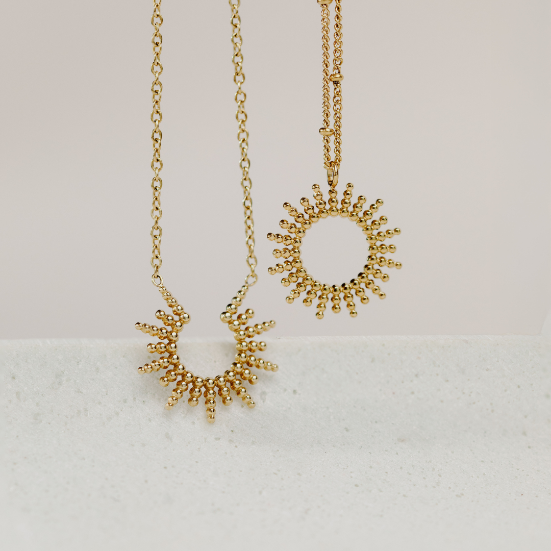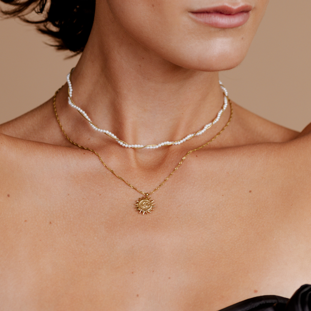 Pay attention to the right necklace length. Short chokers emphasize the neck. Medium-length necklaces sit harmoniously on the décolletage. Longer necklaces elongate the silhouette. The right necklace length ensures that your necklace complements your outfit and flatters your proportions. A little tip: Coordinate the pendant size and chain length so that the piece of jewelry looks balanced and you can create the perfect layered look.