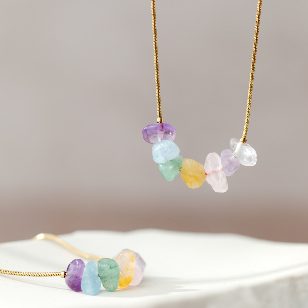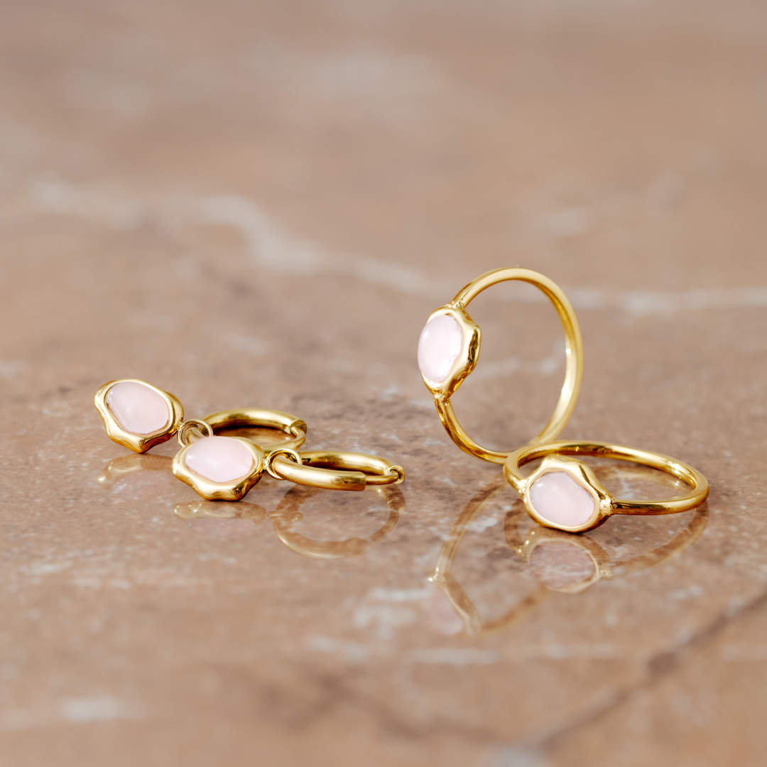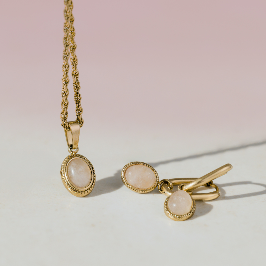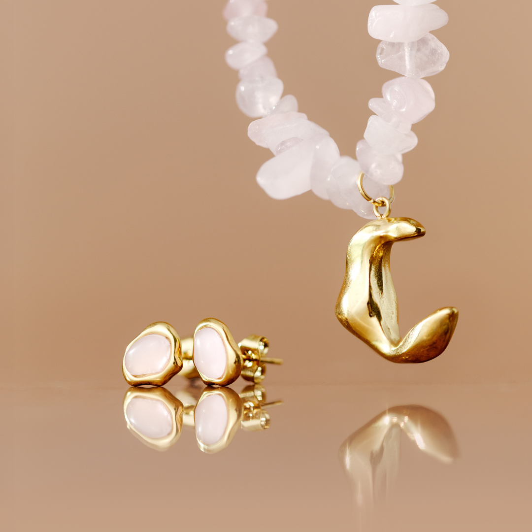 Bei LUAMAYA kommt Quarz in unterschiedlichen Formen zum Einsatz. Verarbeitet werden natürliche Quarzsteine, Quarzvarietäten wie Rosenquarz oder Amethyst sowie ausgewählte laborgezüchtete oder glasbasierte Steine. Die Auswahl orientiert sich an Farbe, Lichtwirkung und Alltagstauglichkeit. In Kombination mit 14 Karat vergoldetem Edelstahl entstehen leichte Schmuckstücke, bei denen der Stein das Design ergänzt, ohne zu dominieren.