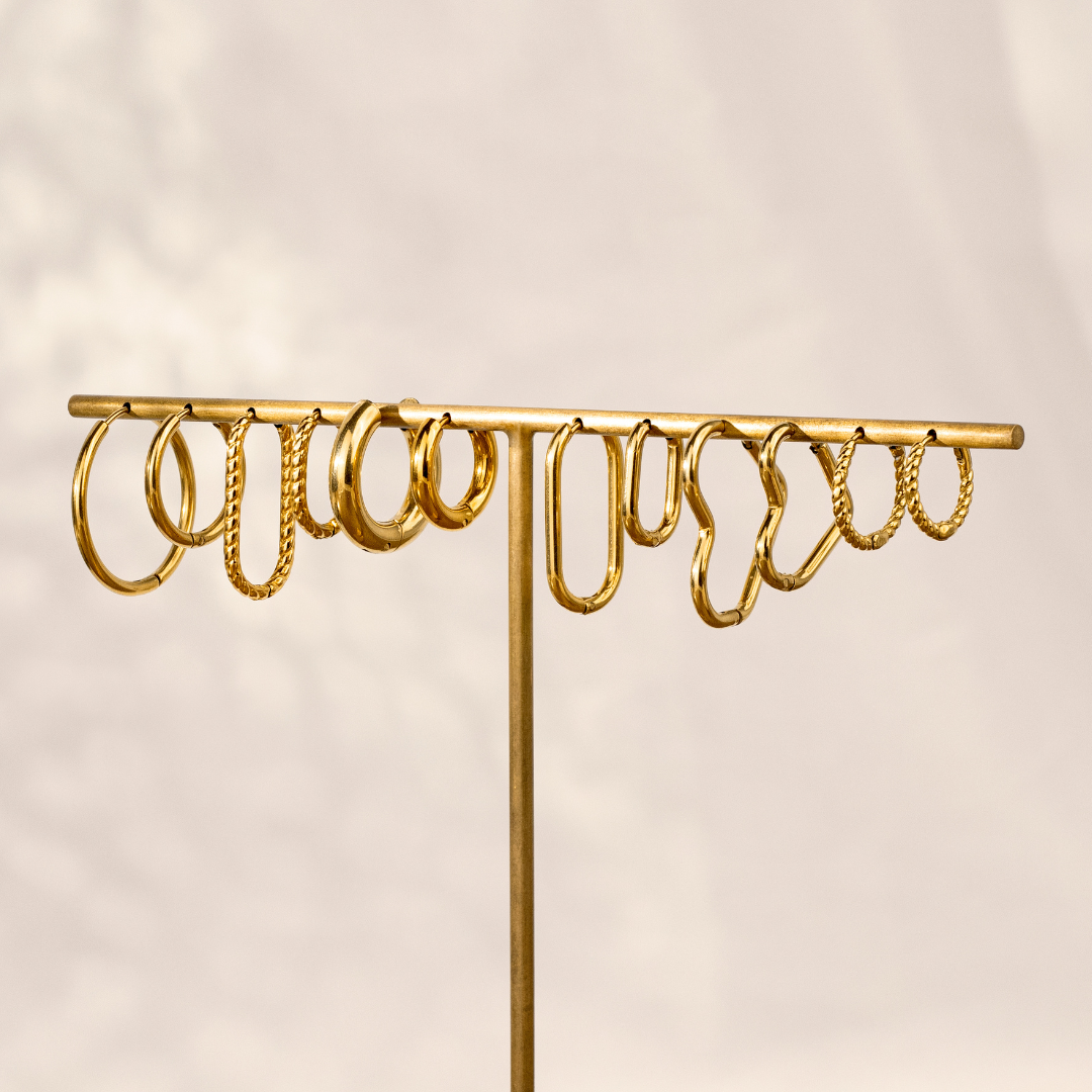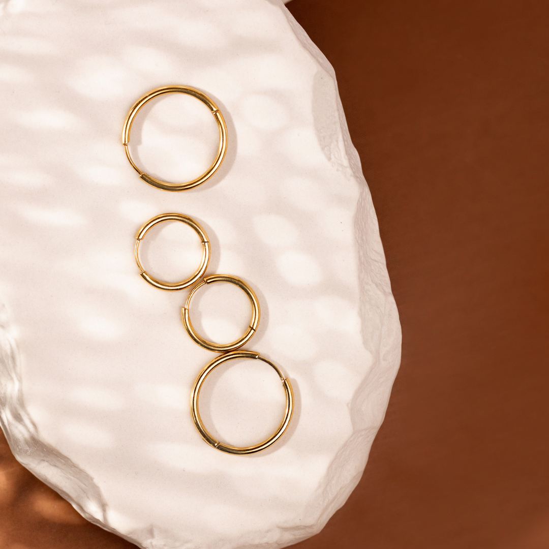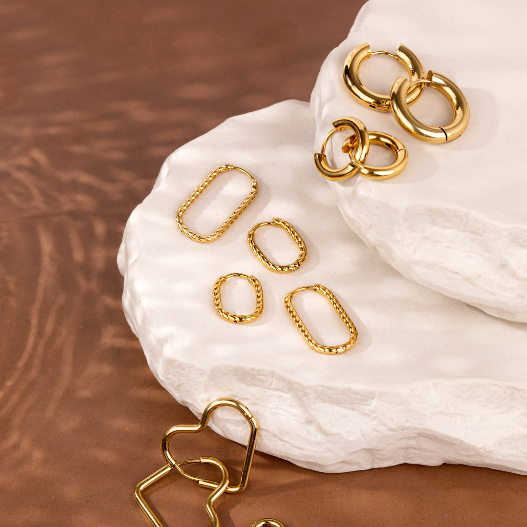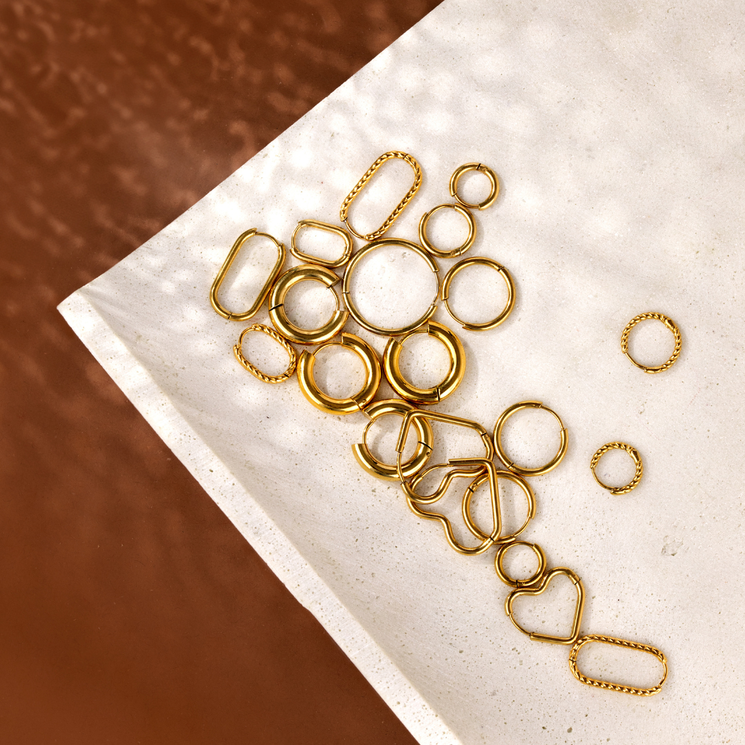 LUAMAYA bietet Creolen in hochwertiger Qualität, gefertigt aus 14K vergoldetem Edelstahl. Diese Variante kombiniert den elegante Look von Gold mit der Robustheit und Haltbarkeit von Edelstahl. Die Vergoldung ist pflegeleicht, nickelarm und wasserfest, sodass die Creolen auch für empfindliche Haut geeignet sind.