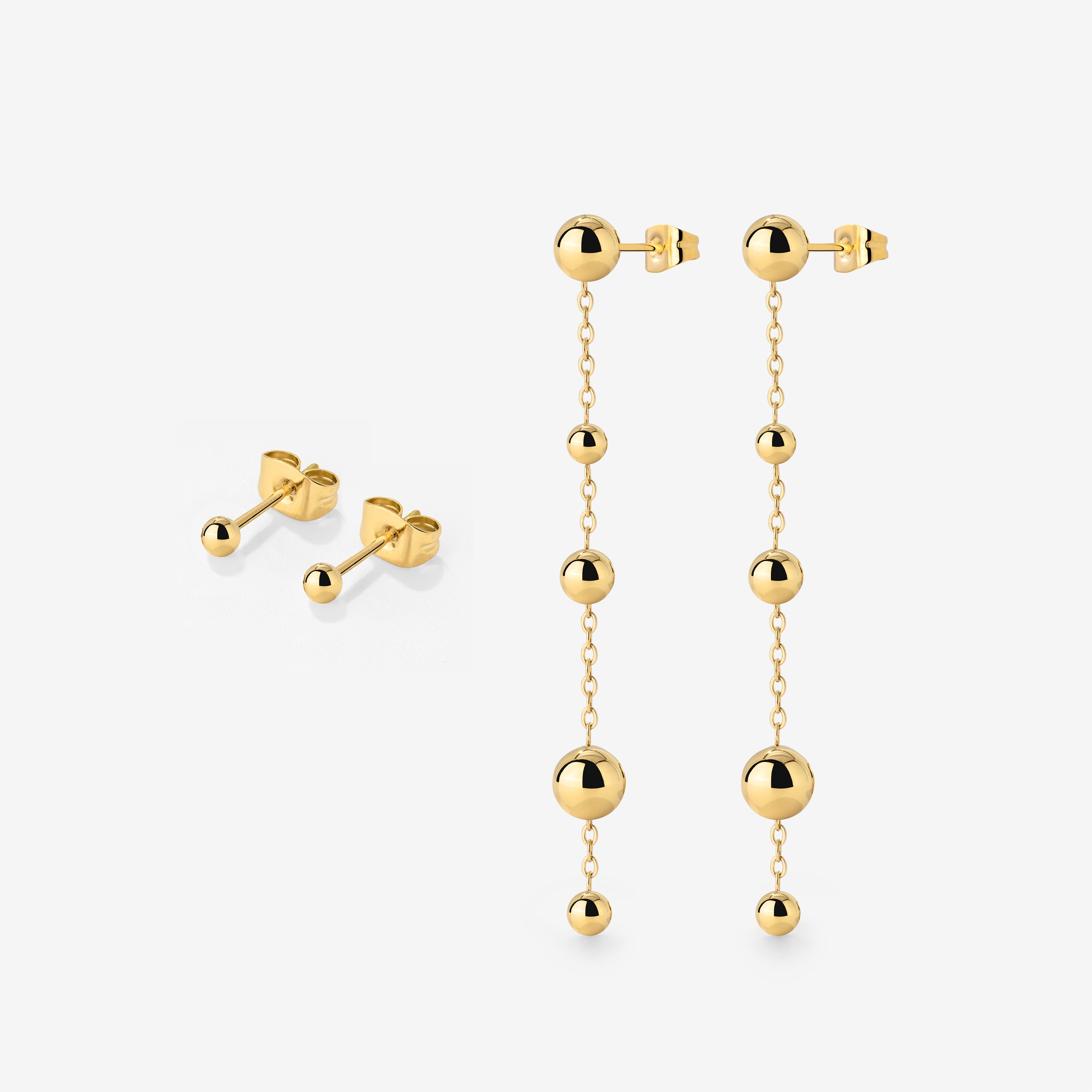 Dezent, aber mit einem Touch edgy und bold? Das klingt nach unserem “Beady” Bundle! Während die “Delicate Bead” Studs an deinem zweiten oder dritten Ohrloch sanft und filigran wirken, ziehen unsere “Infinite Beads” Earrings alle Blicke mühelos auf sich. Die längeren Hänger Ohrringe bestehen aus unterschiedlich großen Kugeln, die durch eine dünne Chain aneinandergekettet sind. Dadurch bekommst du ein zusammengestelltes Earcandy Set, welches dich zu jedem Anlass begleiten kann und nie verfehlt!