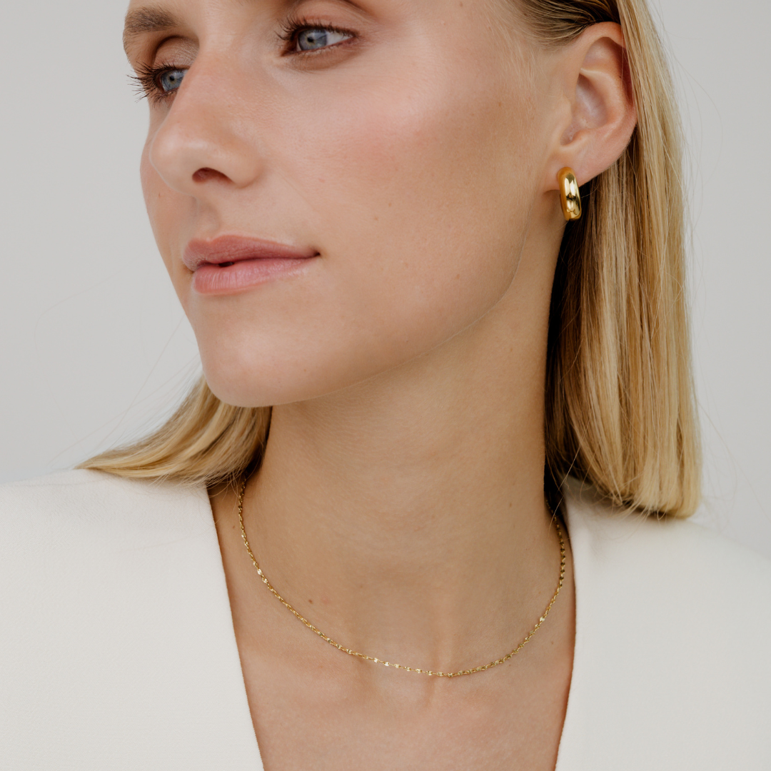 A little bold is fine for you, but not too much, and with a touch of timeless elegance? Then our “Cheeky” bundle is just right for you! While our “Bulky” Hoop Studs are more eye-catching and suit an edgy style, our “Tinsel Chain” necklace with its small, delicate chain links is much more refined and detailed. Still, these two pieces complement each other perfectly, giving you a trendy and modern look.
