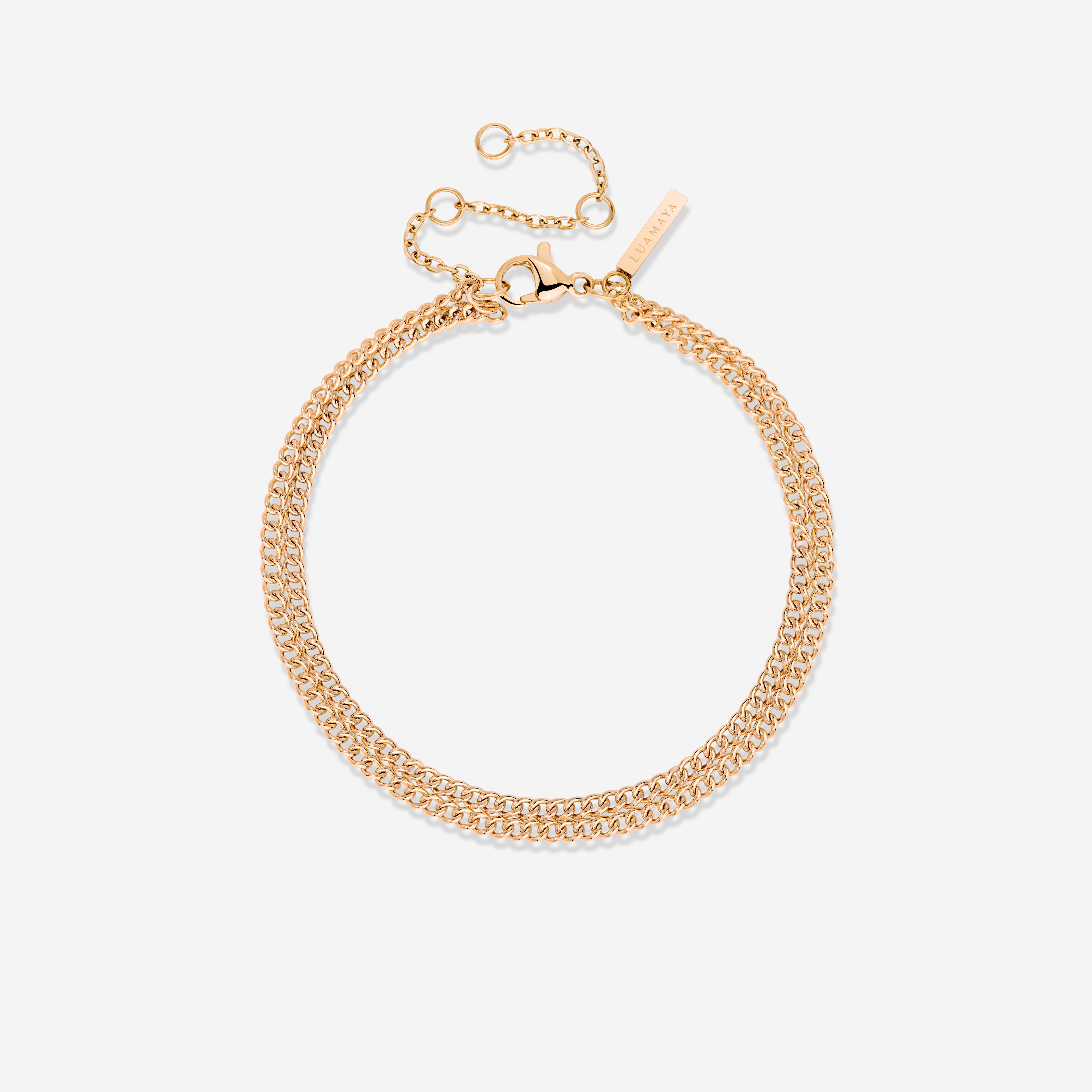 Good basics are essential all year round, whether you want to wear them minimally on their own or layer them to highlight your other jewelry. Our “Curb Chain” Double Bracelet gives you just that — and a little extra! The slim chain with interlocking links is one of the most classic and timeless jewelry designs, easily pairing with any of your other bracelets for versatile styling. The double chain, however, makes this piece a slightly different basic, adding a fresh twist to an otherwise minimalist vibe.