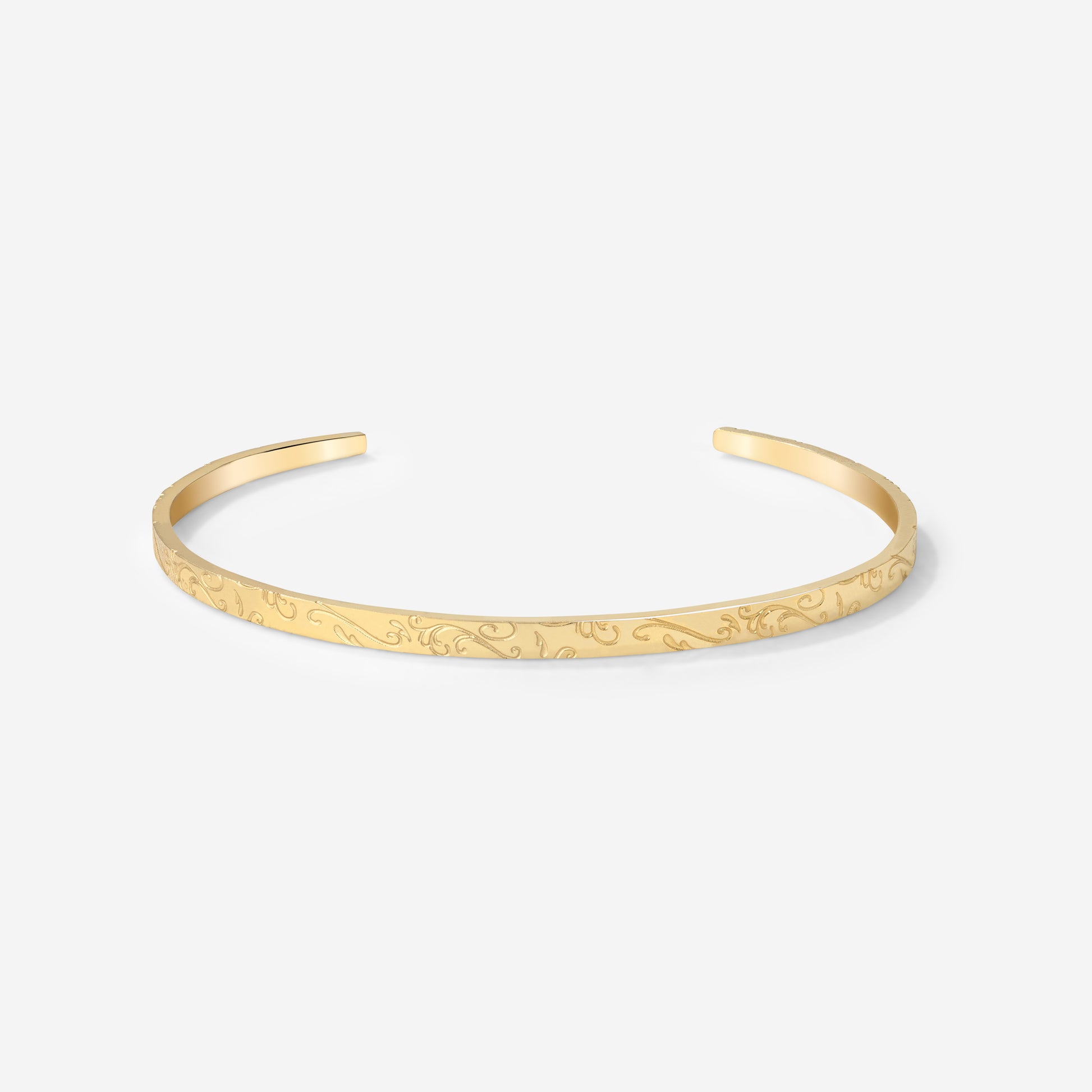 Curved, orient-inspired engravings meet a minimalist, sleek design in our “Desert Glow” Bangle! If you love wearing bracelets but want to try something a little different, bangles are just the thing for you. Thanks to the opening on one side, you can easily adjust and slide it along your arm to create new looks whenever you like. With its subtle engraved details, it pairs beautifully with all your other jewelry and can be worn both for everyday moments and special occasions!