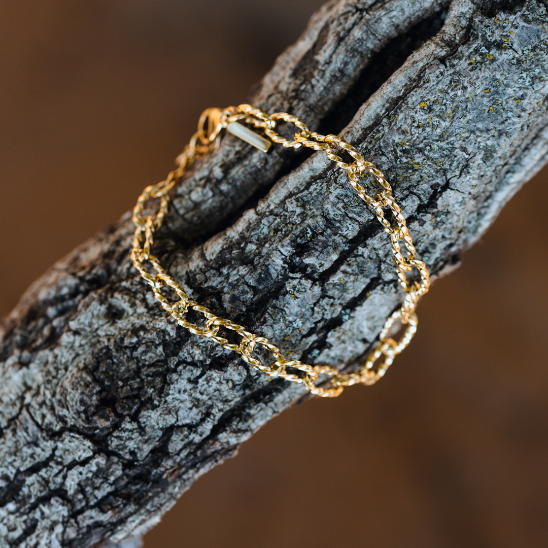 Our “Fantasy Chain” Bracelet is the perfect piece for layering and mixing. The small, oval chain links feature grooves and raised details that create unique light reflections, making you shine beautifully. This special texture transforms a simple bracelet into a truly distinctive piece, ideal if you want to step a little outside your comfort zone. Classic and timeless, yet trendy and modern – with our bracelet, you can have it all!