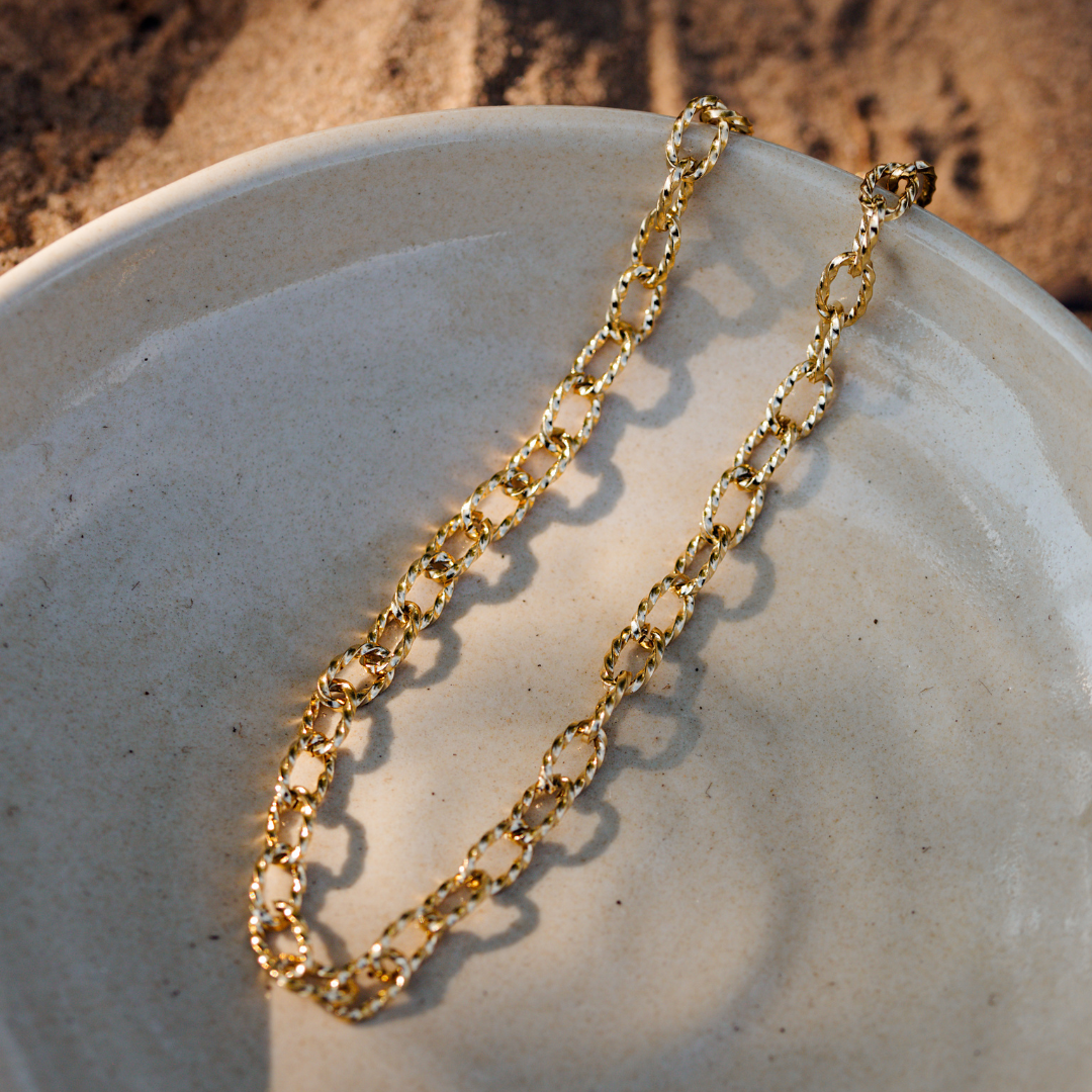 Our “Fantasy Chain” Necklace is the perfect piece for layering and mixing. The small, oval chain links feature grooves and raised details that create unique light reflections, making you shine beautifully. This special texture transforms a simple necklace into a truly distinctive piece, ideal if you want to step a little outside your comfort zone. Classic and timeless, yet trendy and modern – with our necklace, you can have it all!