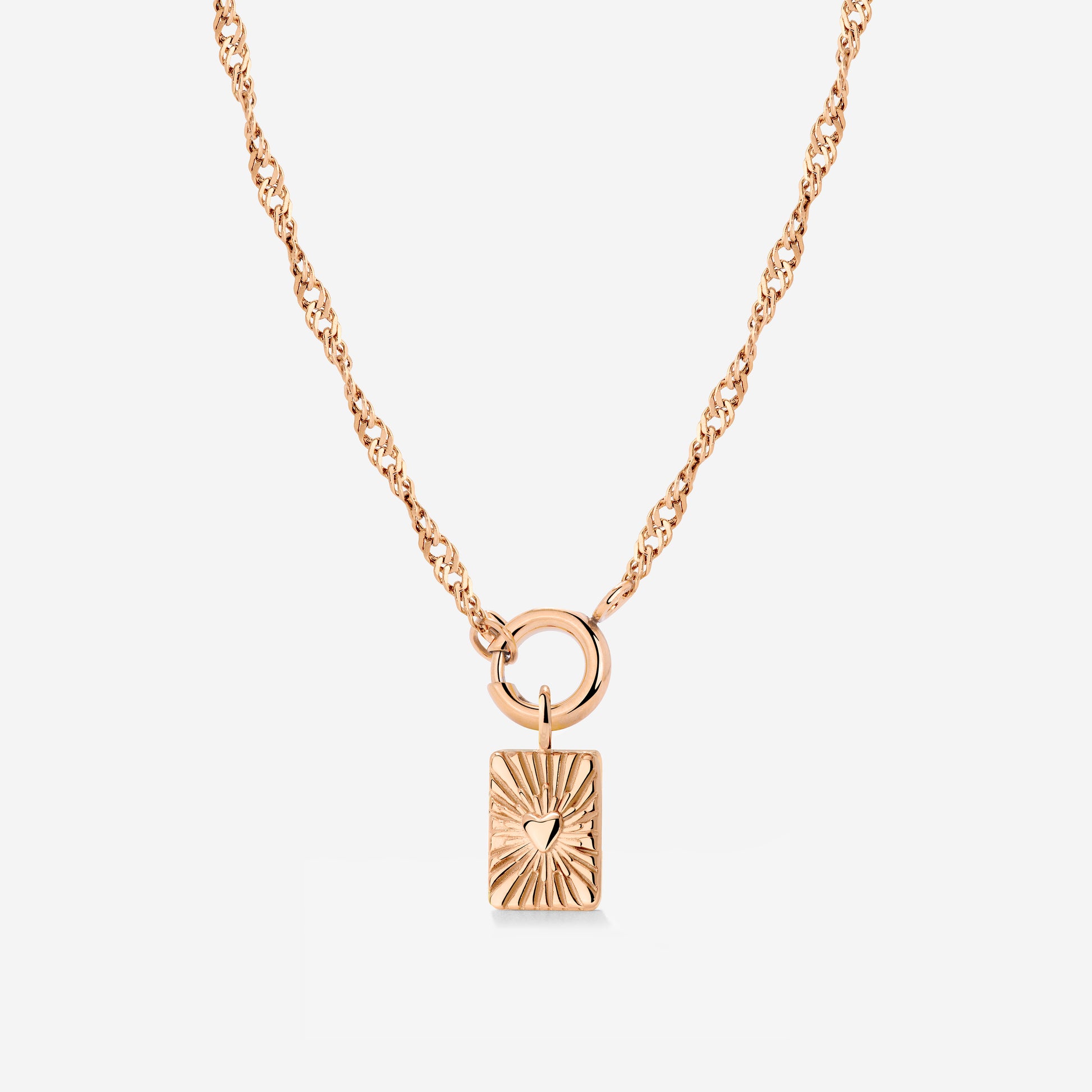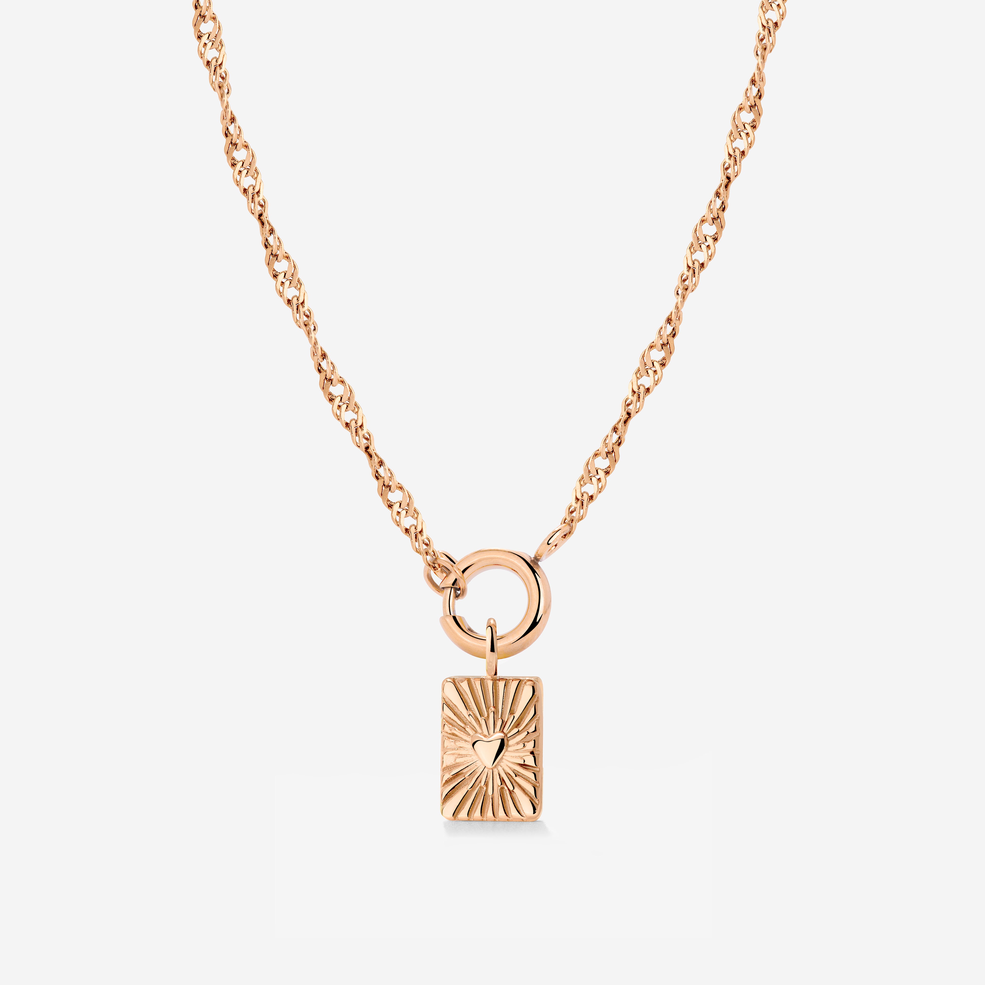 Unser “Glowing Heart” Singapore Chain Necklace Set sieht aus, als wäre es direkt einer alten Schatztruhe entsprungen, bevor es zu deinem neuen Lieblings-Piece wurde! Die filigrane Singapore Chain unterstreicht das zarte Design des rechteckigen Charms mit kleinem Herz in der Mitte. Von ihm fließen Linien nach außen, die an Sonnenstrahlen erinnern und dem Schmuckstück einen dreidimensionalen Touch verleihen. Trage die Halskette als kleinen Self-Love Reminder oder schenke sie deiner besten Freundin als Zeichen deiner Wertschätzung.