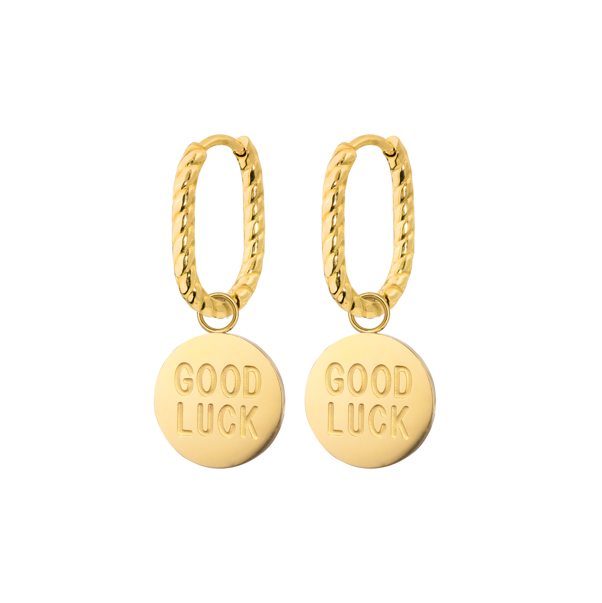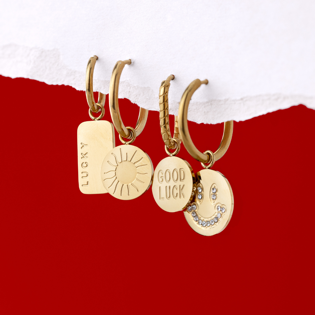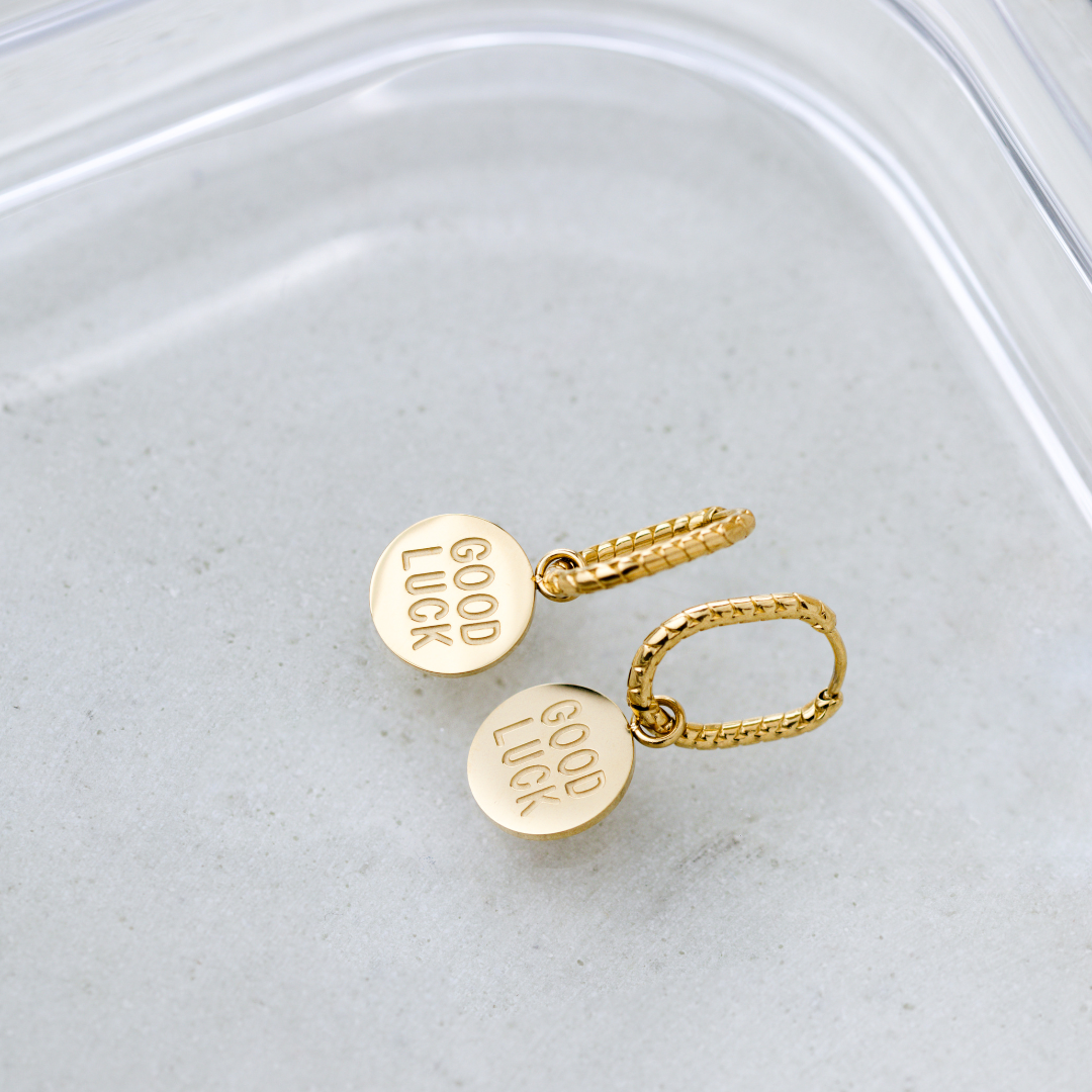 Direct messages are totally your thing, and you want to carry them with you wherever you go? With our 'Good Luck Coin' Oval Twisted Hoop Set Baby, you’ll have your luck message right by your ear, ensuring it sweetens your day. The twisted oval hoops add the perfect finishing touch to the look and work with any outfit, so you’ll always have the perfect piece of jewelry ready to go.