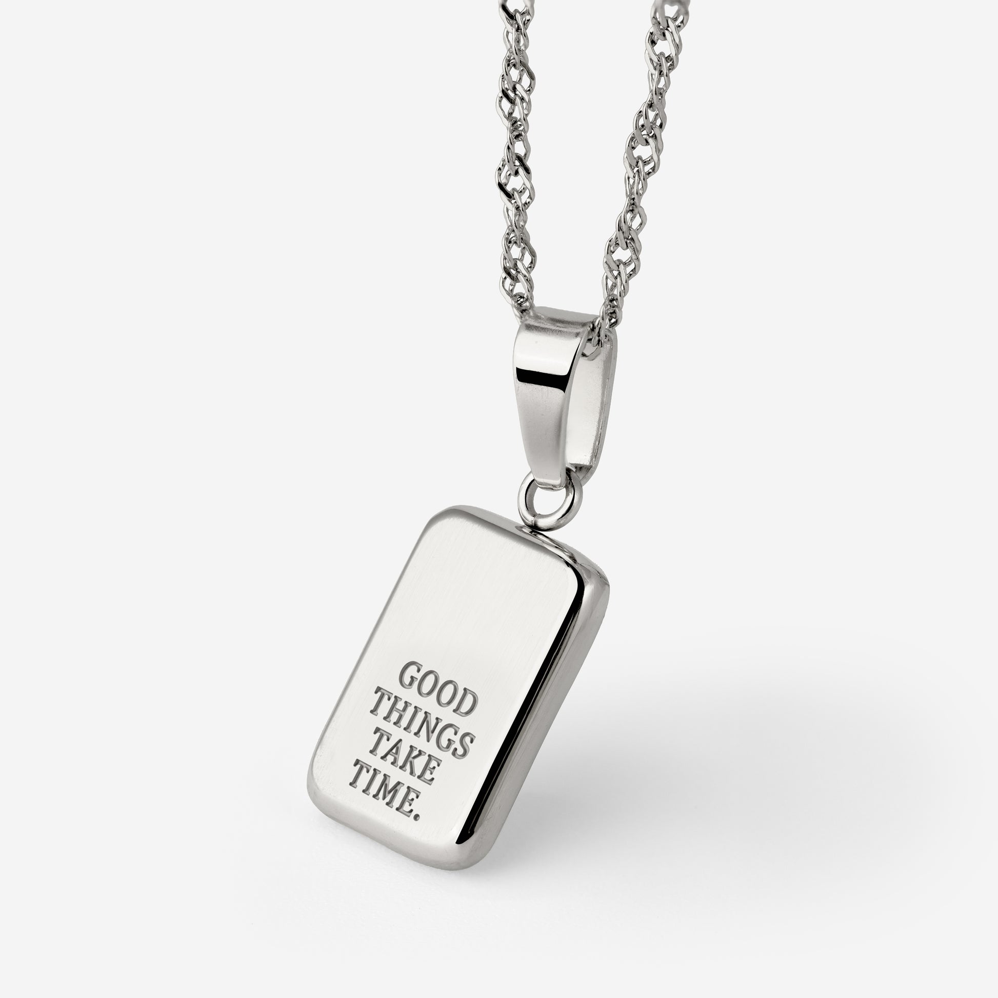 Sometimes it feels like nothing is moving forward, like you’re stuck in one place. Our “Good things take time” necklace is here to remind you that it takes time for things to unfold. When the right moment comes, you’ll see all your progress and realize that everything was part of the process. Wear the delicate Singapore chain with engraved pendant as a daily reminder of what you’ve already achieved and what’s yet to come. Sometimes the journey is the destination.