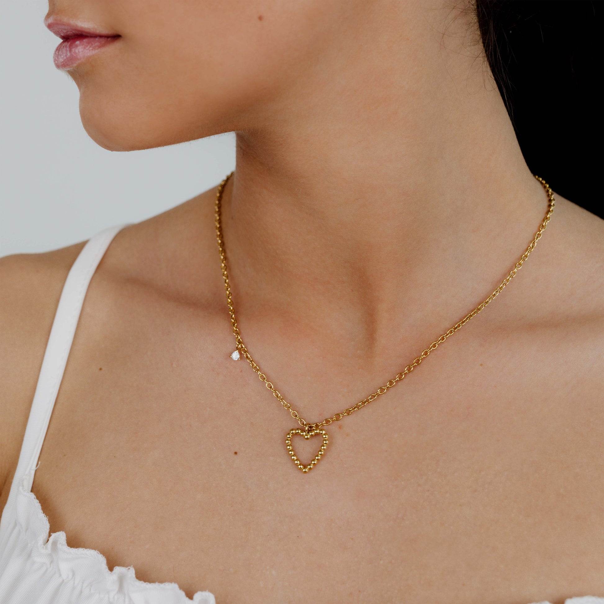 You have a heart of gold – and it’s time to show it! Our 'Heart of Gold' Necklace combines timeless elegance with a trendy twist: a delicate heart pendant in a dotted design and a sparkling zirconia stone placed off-center on a classic, slightly chunky chain make this piece truly special. Whether worn on its own or layered with other necklaces, for everyday wear or special occasions, this necklace is a true eye-catcher that’s guaranteed to turn heads!
