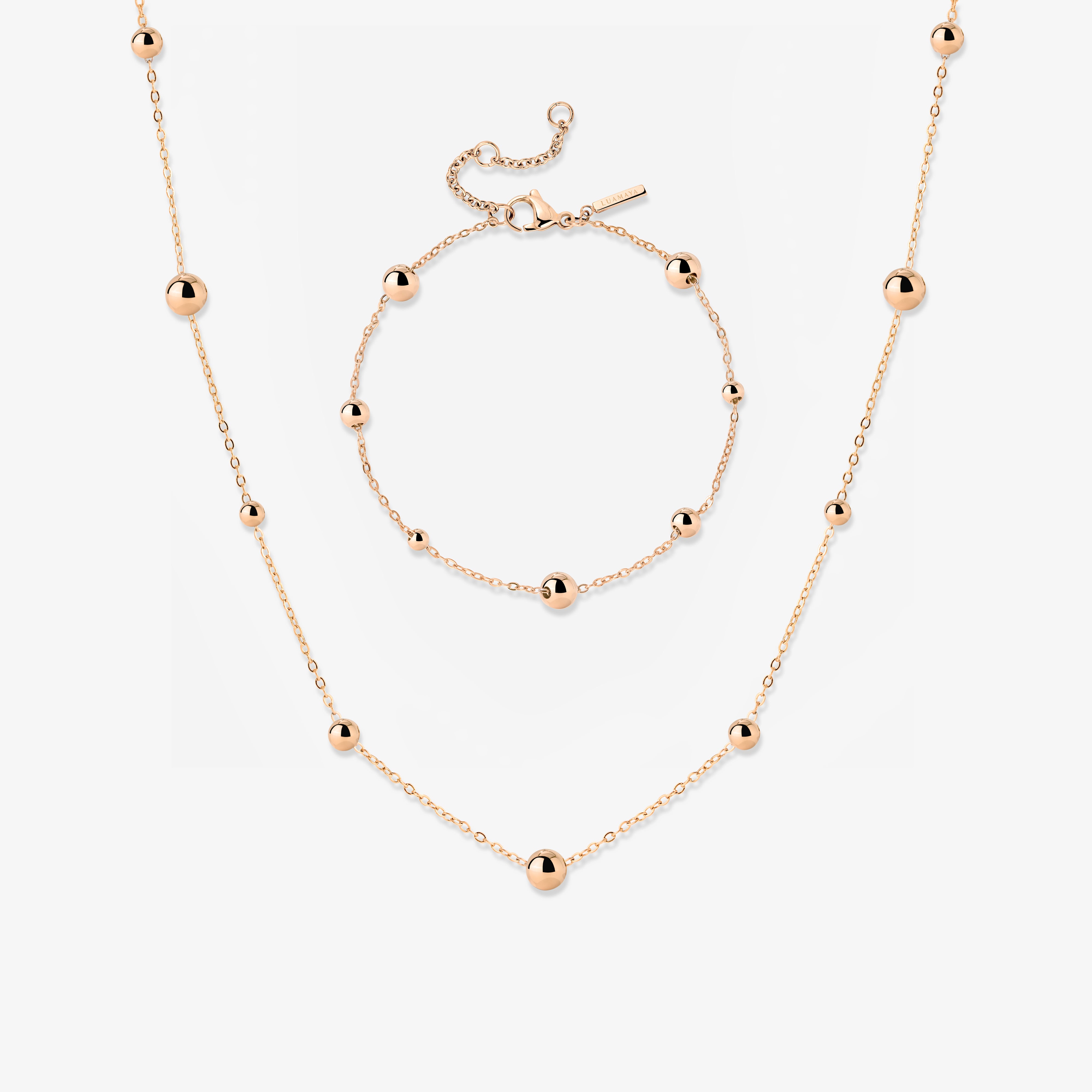 Unterschiedlich große Beads verzieren die filigranen Chains in regelmäßigen Abständen und geben sowohl unserer “Infinite Beads” Necklace als auch unserem “Infinite Beads” Bracelet einen verspielten, aber dennoch dezenten und minimalistischen Look. Als “Infinite Beads” Bundle bekommst du beide Schmuckstücke gleich zusammen und kannst sie als perfect Match ganz leicht miteinander kombinieren, ohne dir viele Gedanken um deinen Look machen zu müssen. Diese Pieces passen zu jedem deiner Outfits und zu jedem Anlass, ob im Alltag oder für besondere Anlässe!