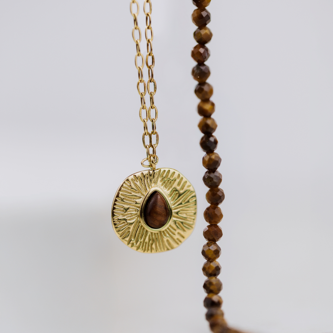 Tiger’s eye is popular in jewelry not only for its warm brown color but also for its attributed properties as a gemstone. For centuries, tiger’s eye has been used, especially in East Asia, as a talisman or amulet and is said to reflect the tiger’s strengths—strength, courage, and vitality. Wearing this stone can help you stay calm in stressful situations and be guided by your instinct and intuition. Our “Into the Wild” Bundle combines our “Tiger’s Eye Bead” Necklace, made of small round tiger’s eye beads, with our “Terra” Necklace featuring an organically shaped pendant and a teardrop tiger’s eye in the center. Its natural color variations, ranging from dark espresso brown to warm ochre, create depth and a unique set that not only complements your outfit but also boosts your confidence. Don’t miss out on it!