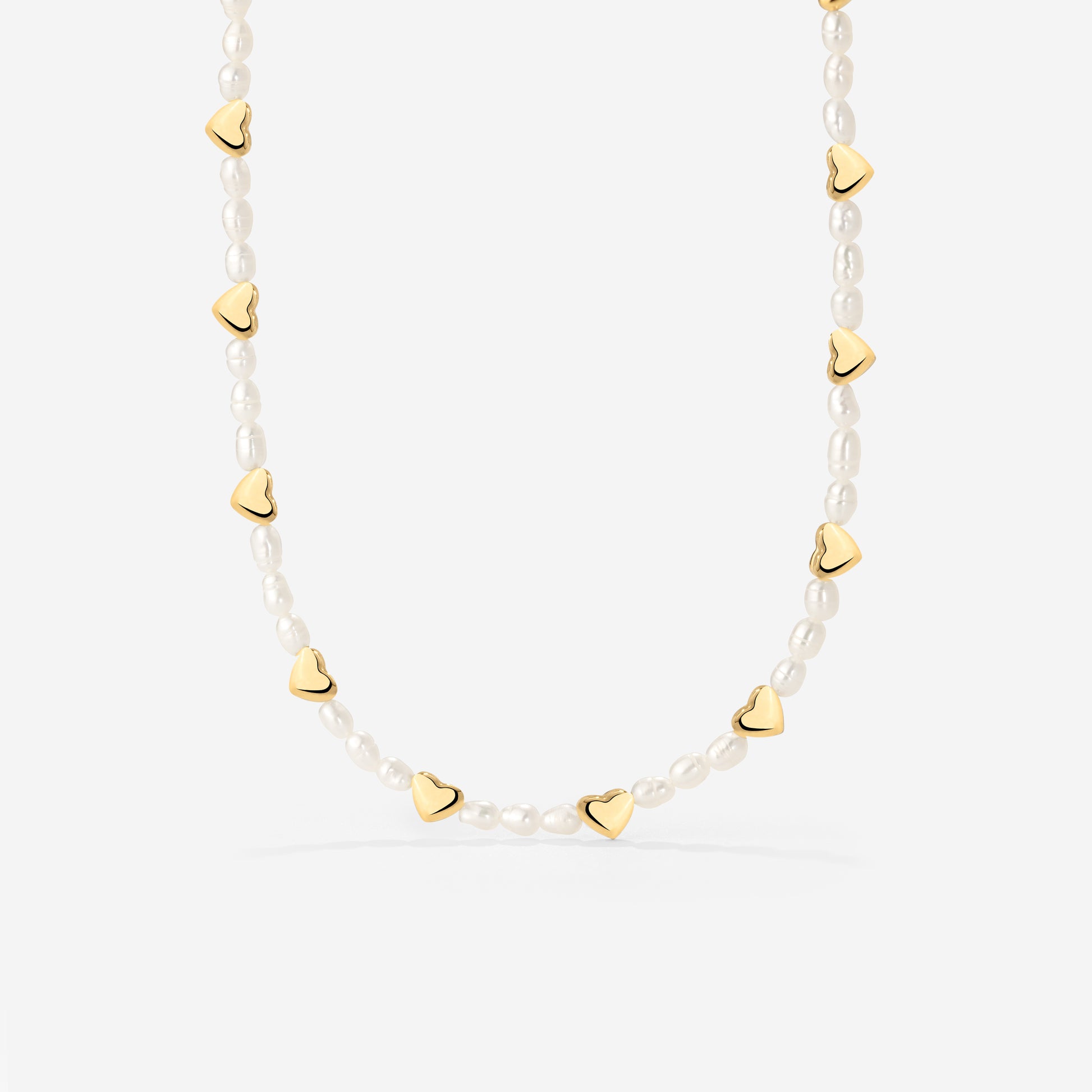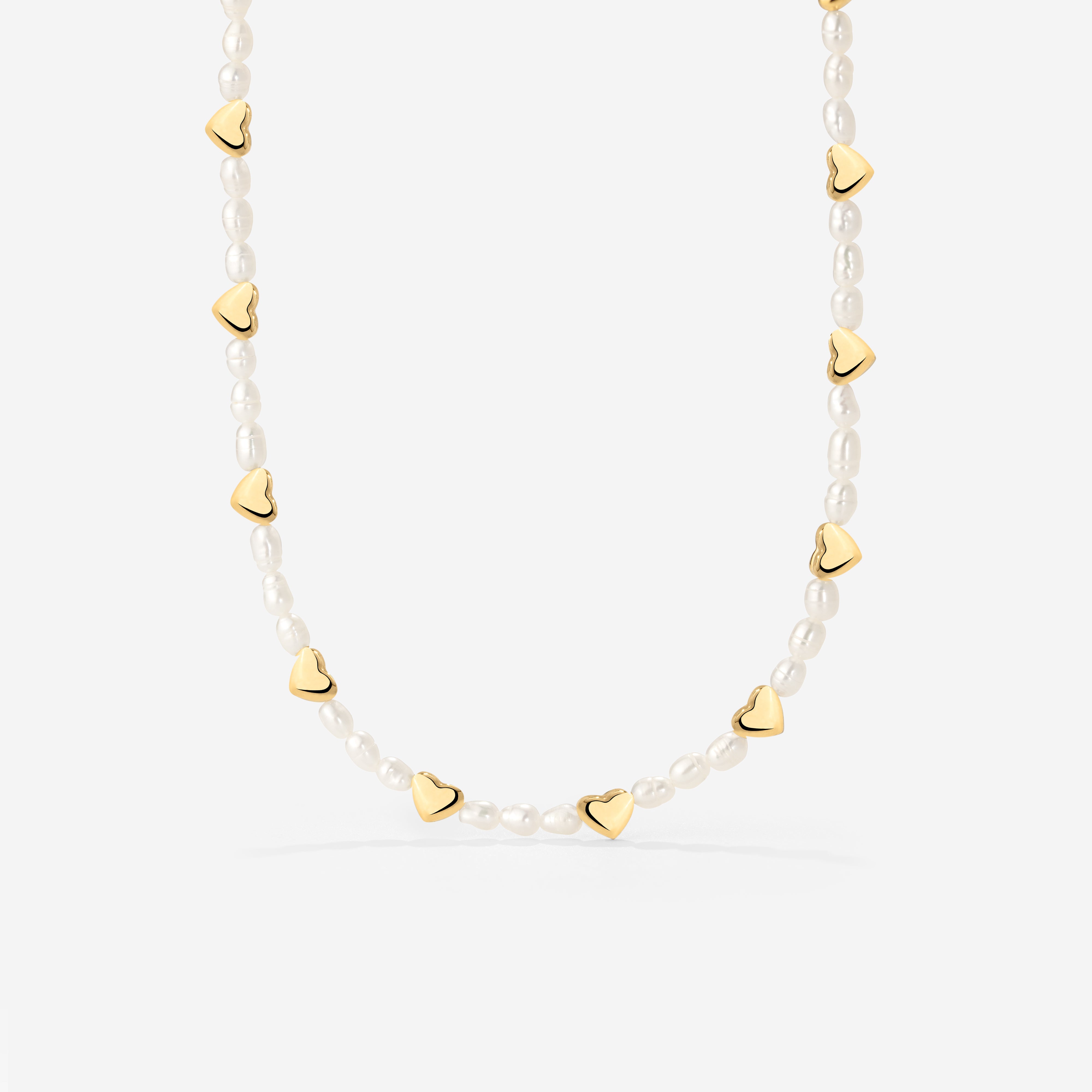 Freshwater pearls are a year-round jewelry staple, cherished for their timeless elegance and constantly reimagined in new trends and designs. Our “Love Pearls” necklace features unique pearls arranged in groups of three, alternating with tiny heart charms that add a playful and cute touch. If you’re looking for a more modern and relaxed take on the classic pearl necklace, this piece is the perfect choice to bring a fresh vibe to your collection!