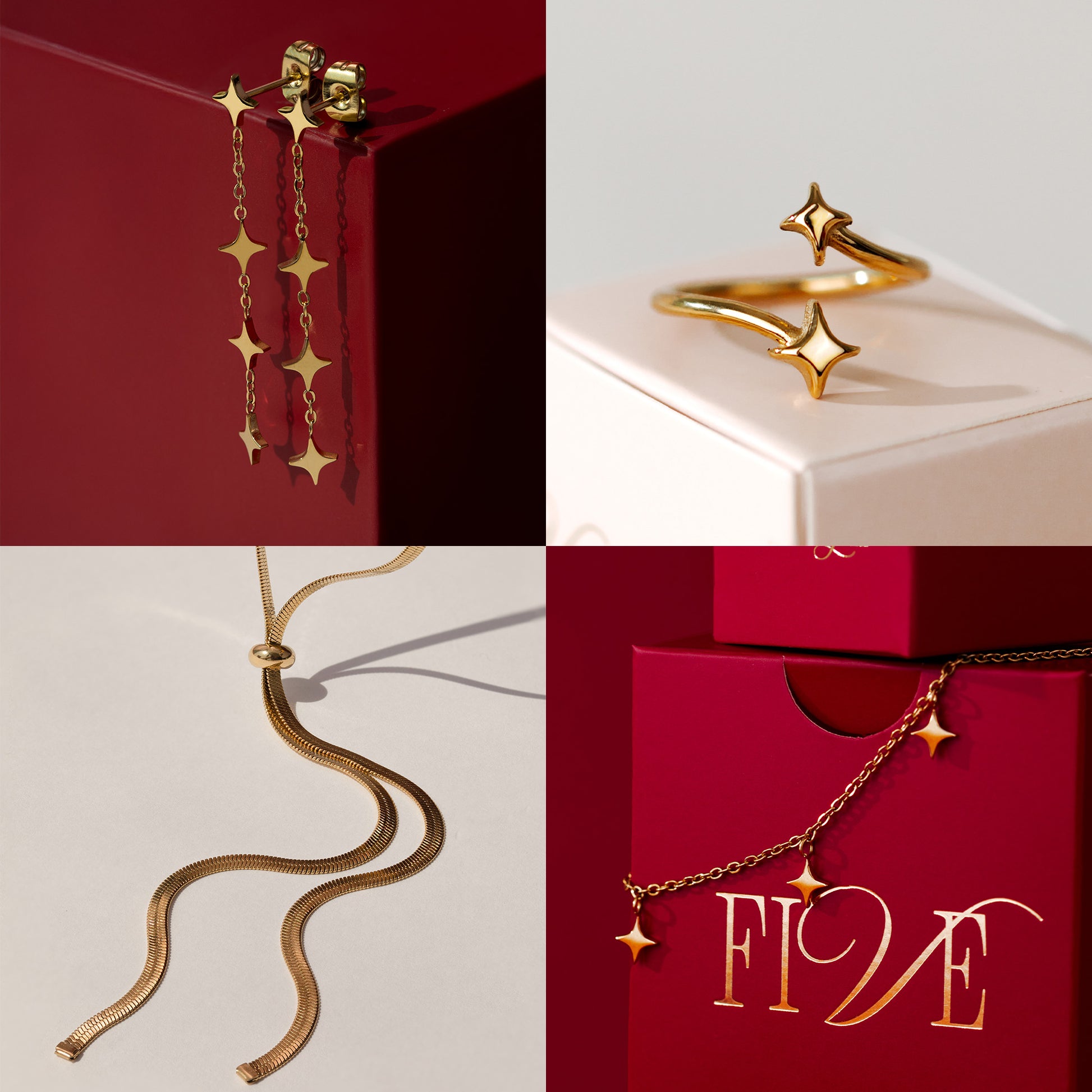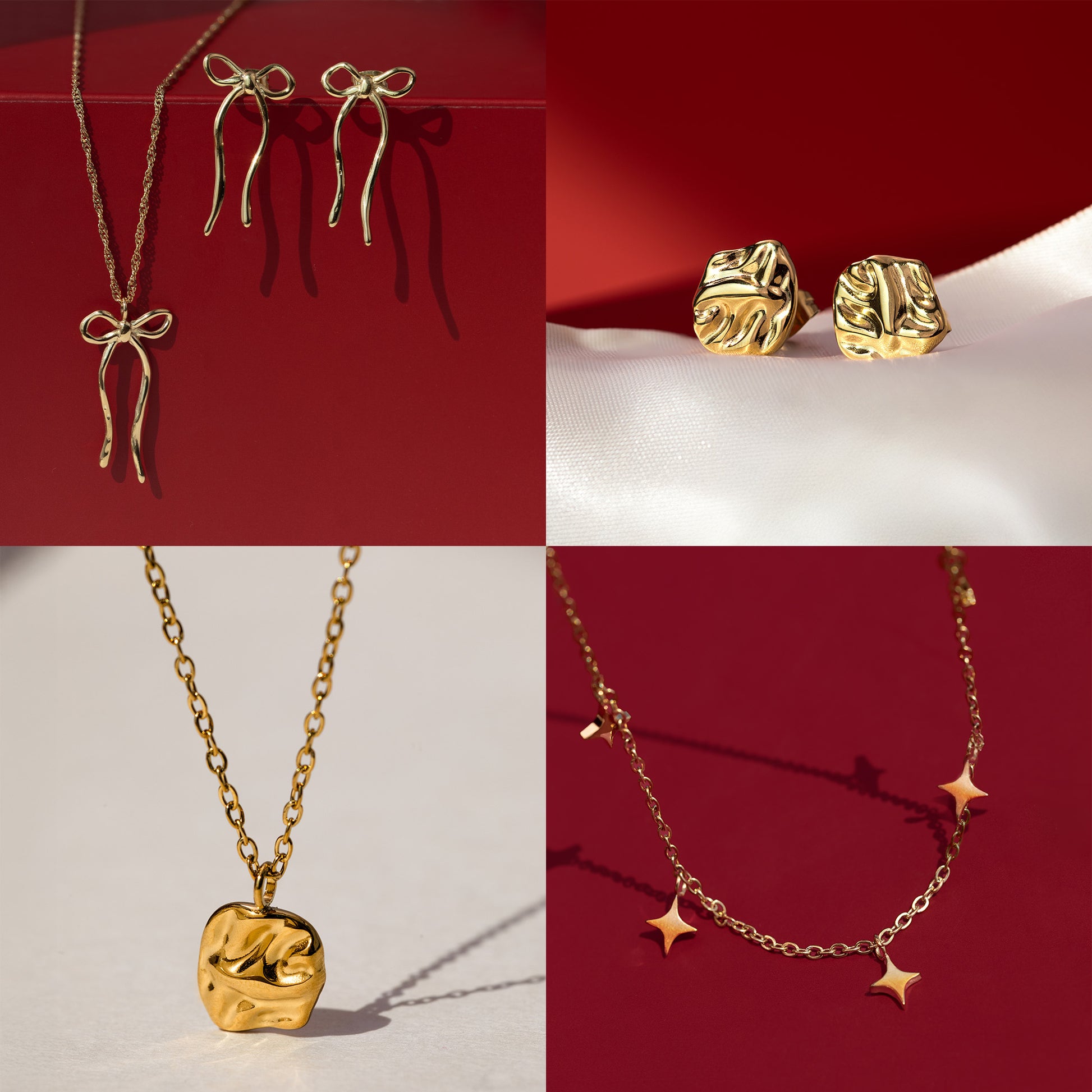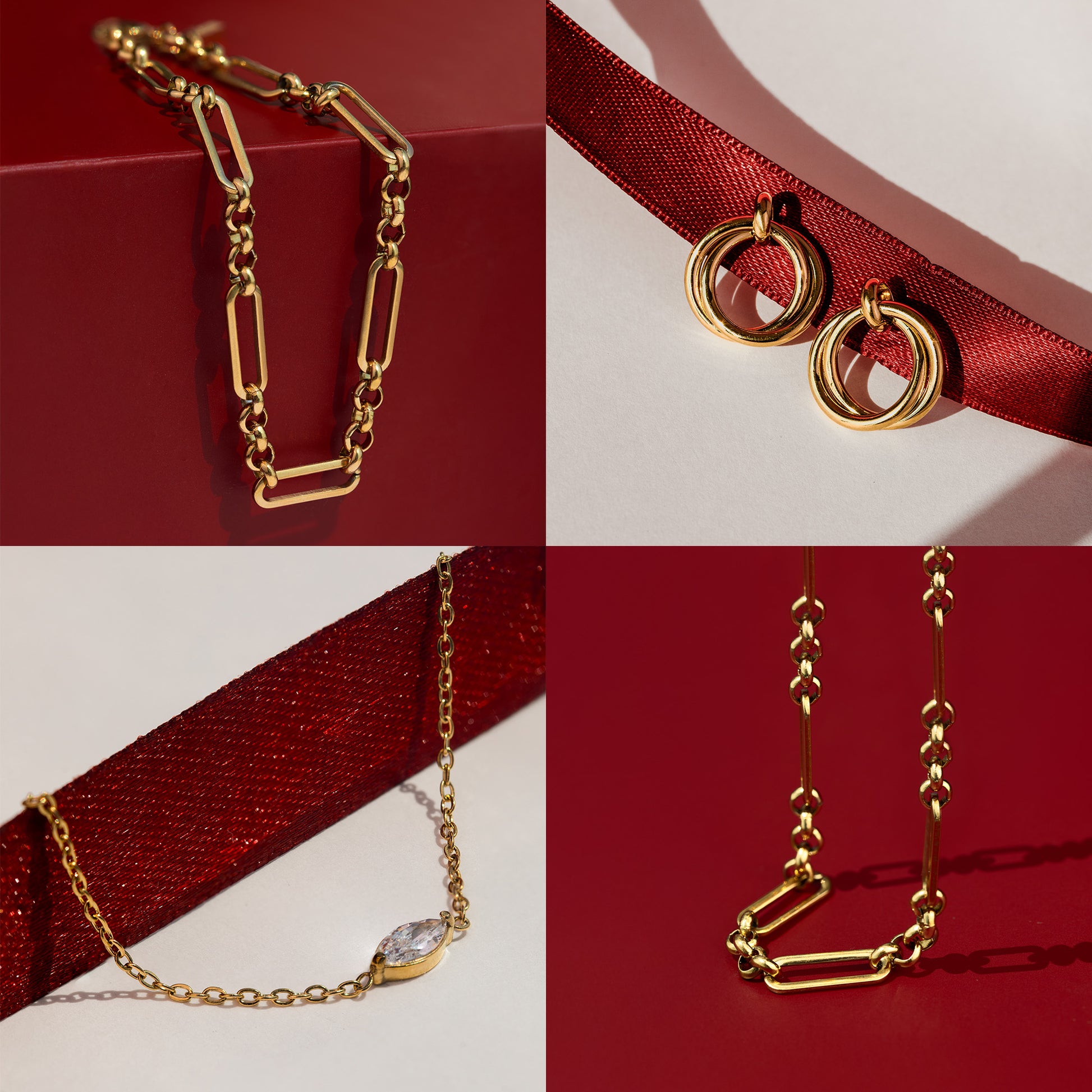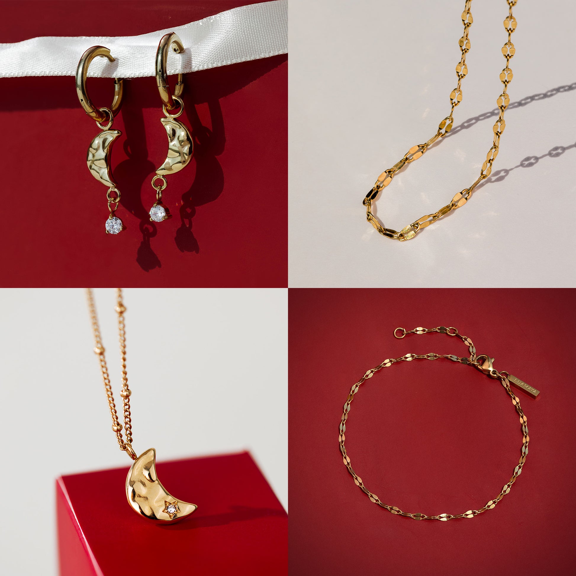 Die Schmuckstücke werden aus 316L Edelstahl gefertigt und besitzen je nach Farbe eine 14 karätige Vergoldung. Sie sind hypoallergen und 100% wasserresistent.