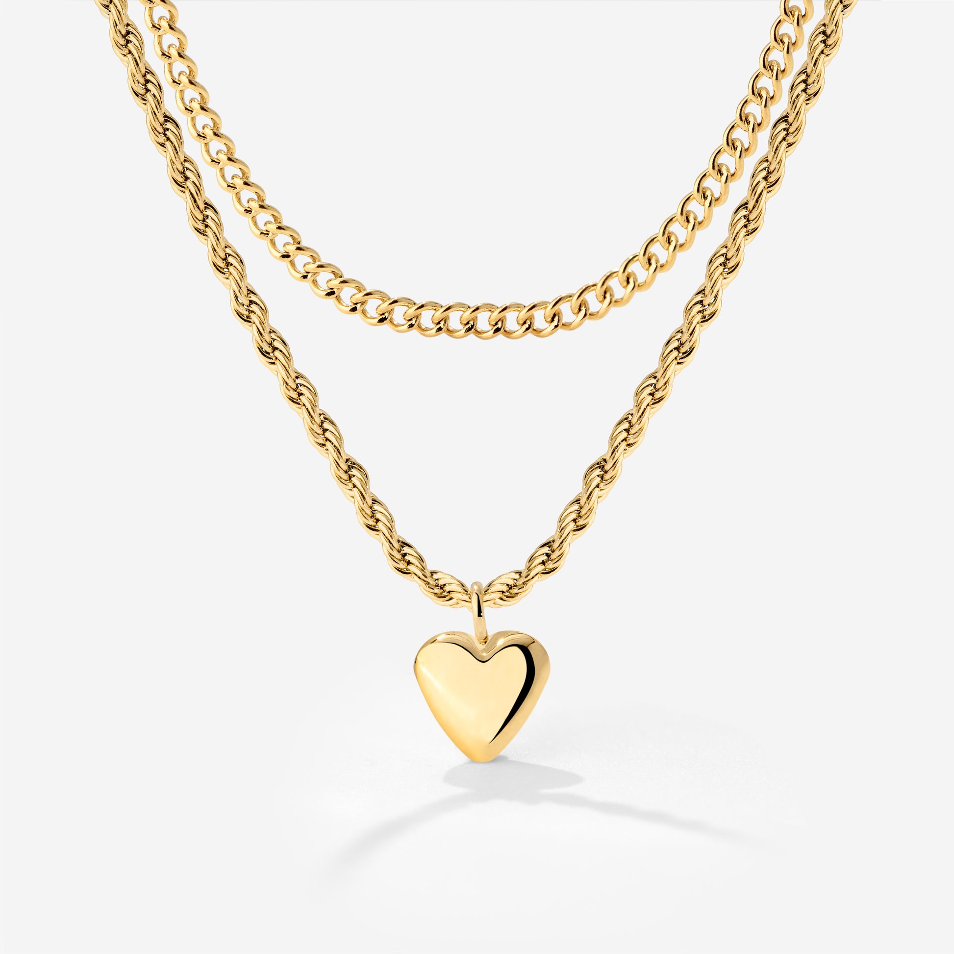 Necklaces with heart pendants have been timeless jewelry classics for centuries — and it’s easy to see why. Whether as a gift for someone special or for yourself, what could be more beautiful than the symbol of love and romance that you can always carry close to your heart on a lovely chain? With our “Made with Love” bundle, you get that and so much more! Our “Sweetieheart” necklace with an elegant rope chain and small, sweet heart pendant pairs perfectly with our basic “Curb Chain” necklace, and as a set for layering, it really shines even more than individually!