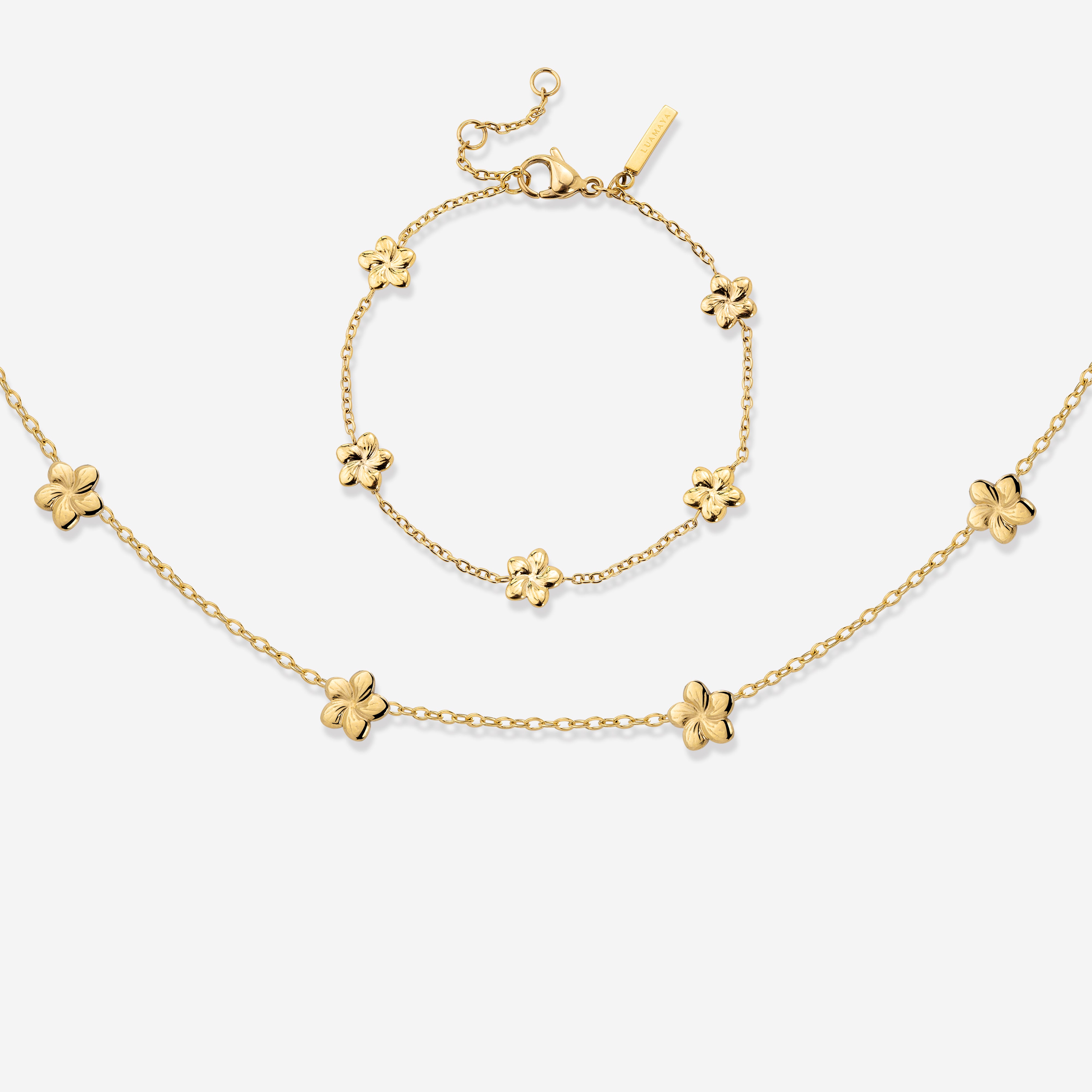 When you think of spring, summer, and sunny weather, you probably imagine a meadow with scattered flowers in green grass while birds chirp in the background. Looking at our “Meadow” bundle, the namesake choker and bracelet remind us exactly of this scene! Five small, cute flower charms adorn the delicate chains, bringing guaranteed positive vibes to your everyday life.