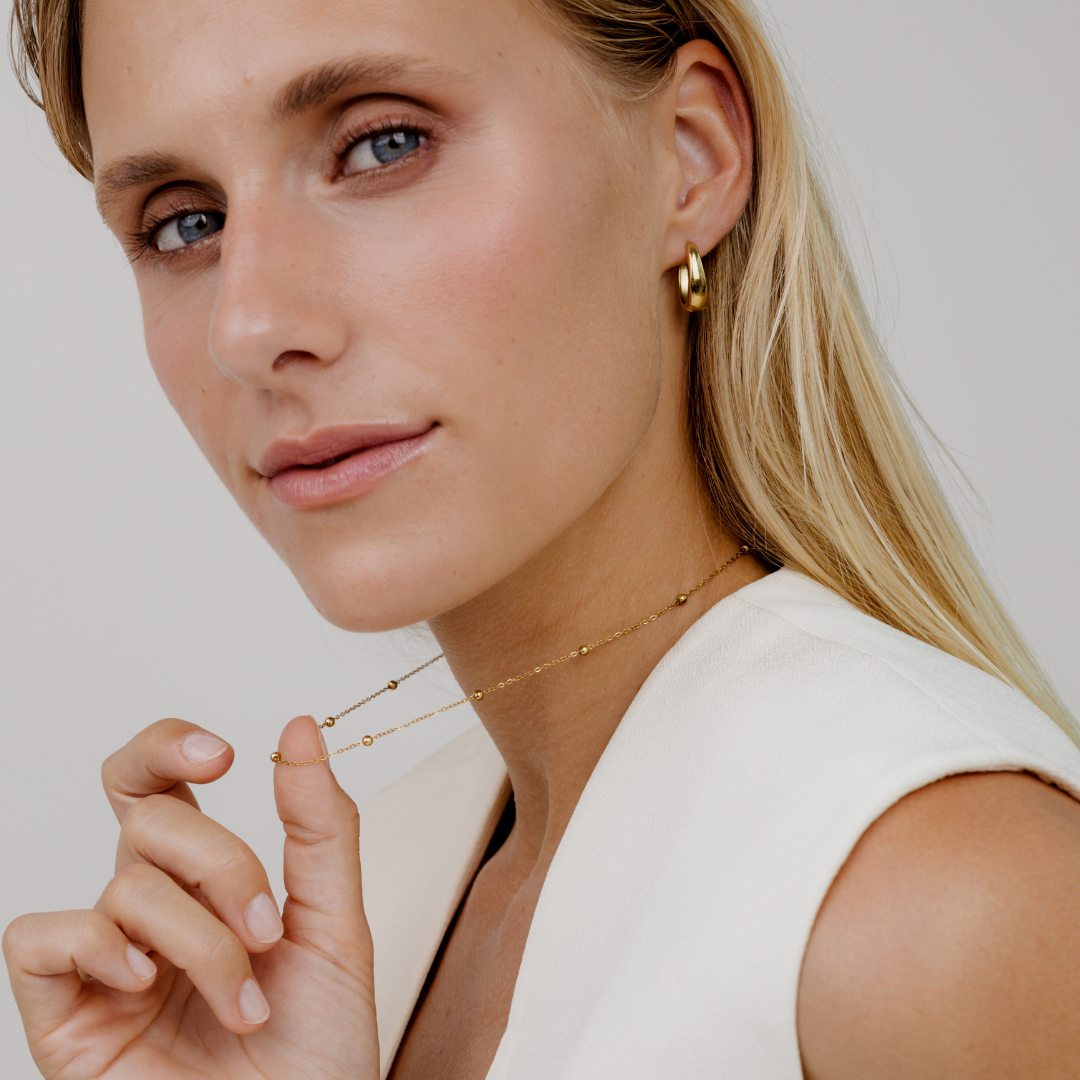 For the minimalist in you who prefers timeless and delicate pieces, we have our “Minimalist” bundle. The classic, oval, slightly wider “Seeker” hoops pair perfectly with the delicate chain of our “Aline” chokers, adorned with small beads at regular intervals. Together, these two pieces create a look that can accompany you on any occasion and every day, matching all your outfits effortlessly.