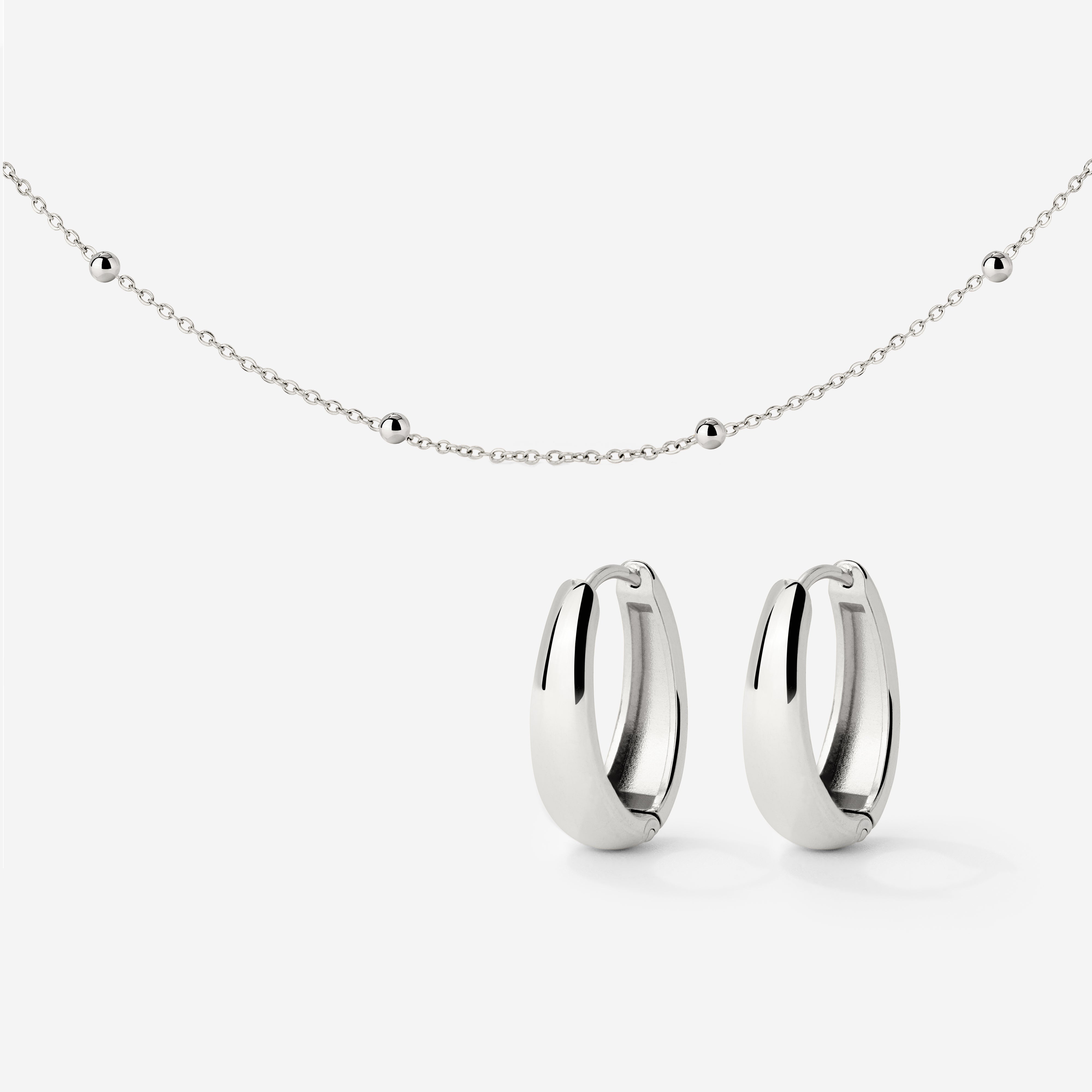 For the minimalist in you who prefers timeless and delicate pieces, we have our “Minimalist” bundle. The classic, oval, slightly wider “Seeker” hoops pair perfectly with the delicate chain of our “Aline” chokers, adorned with small beads at regular intervals. Together, these two pieces create a look that can accompany you on any occasion and every day, matching all your outfits effortlessly.