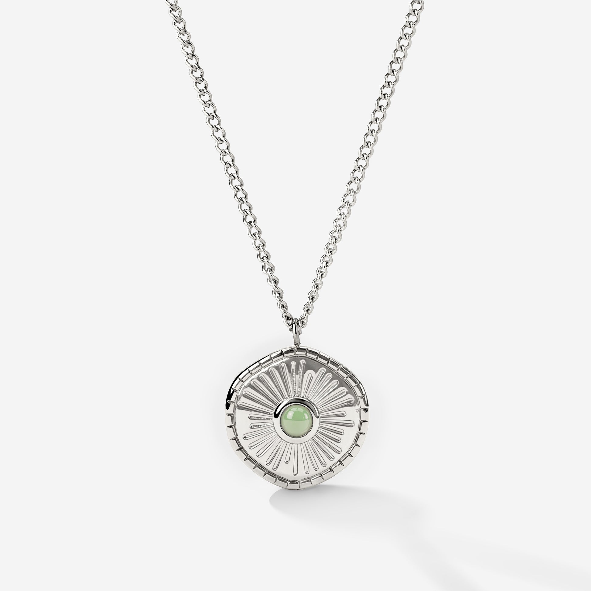 Quartz is often referred to as a stone of purity and protection and can be found in nature in many different shapes and colors. Green quartz is said to promote harmony and help release emotional blockages. In our “Moss” Necklace, the small green natural quartz stone is the focal point of the piece. Set in an organically rounded coin pendant, it is subtle yet eye-catching and enhanced by fine engraved lines that make it shine. Let this necklace be your little lucky charm and a daily reminder of balance and positive energy – don’t miss out on it!