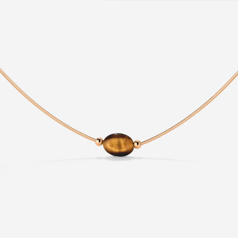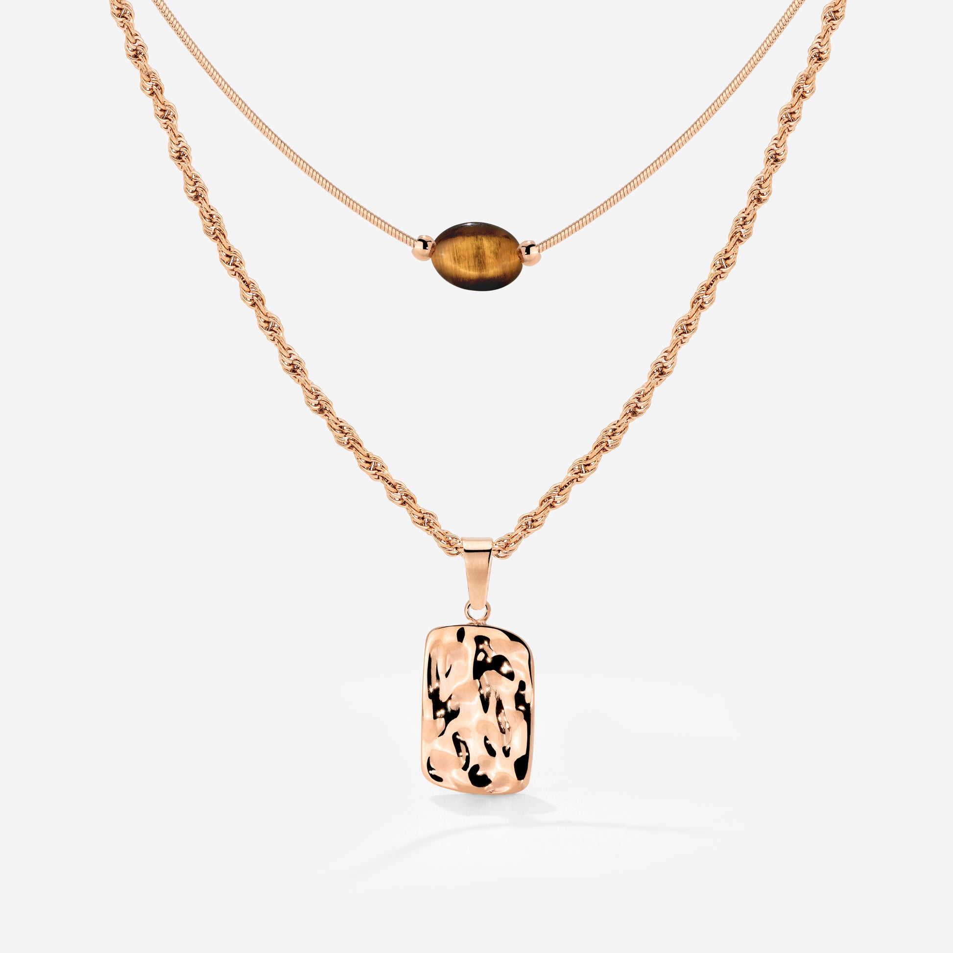 Two necklaces that perfectly complement each other in our “Oasis Gleam” Bundle: Our “Fata Morgana” Necklace captures the play of light and shadow with its organically structured pendant, reminiscent of shimmering autumn sunlight. Our “Sunflare Gem” Choker creates a refined contrast with its minimalist design, highlighted by the warm tiger’s eye gemstone that symbolizes intuition and clarity. Layered together, you get a bold-meets-minimal combination that works for any occasion!