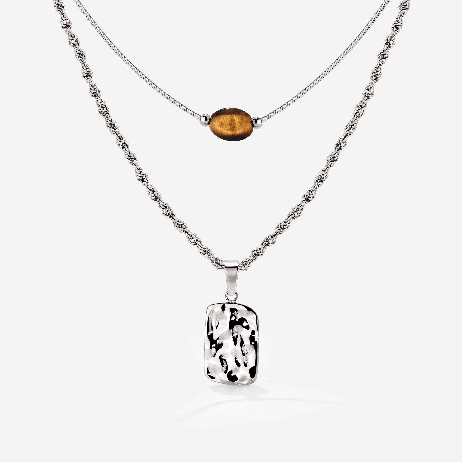 Two necklaces that perfectly complement each other in our “Oasis Gleam” Bundle: Our “Fata Morgana” Necklace captures the play of light and shadow with its organically structured pendant, reminiscent of shimmering autumn sunlight. Our “Sunflare Gem” Choker creates a refined contrast with its minimalist design, highlighted by the warm tiger’s eye gemstone that symbolizes intuition and clarity. Layered together, you get a bold-meets-minimal combination that works for any occasion!