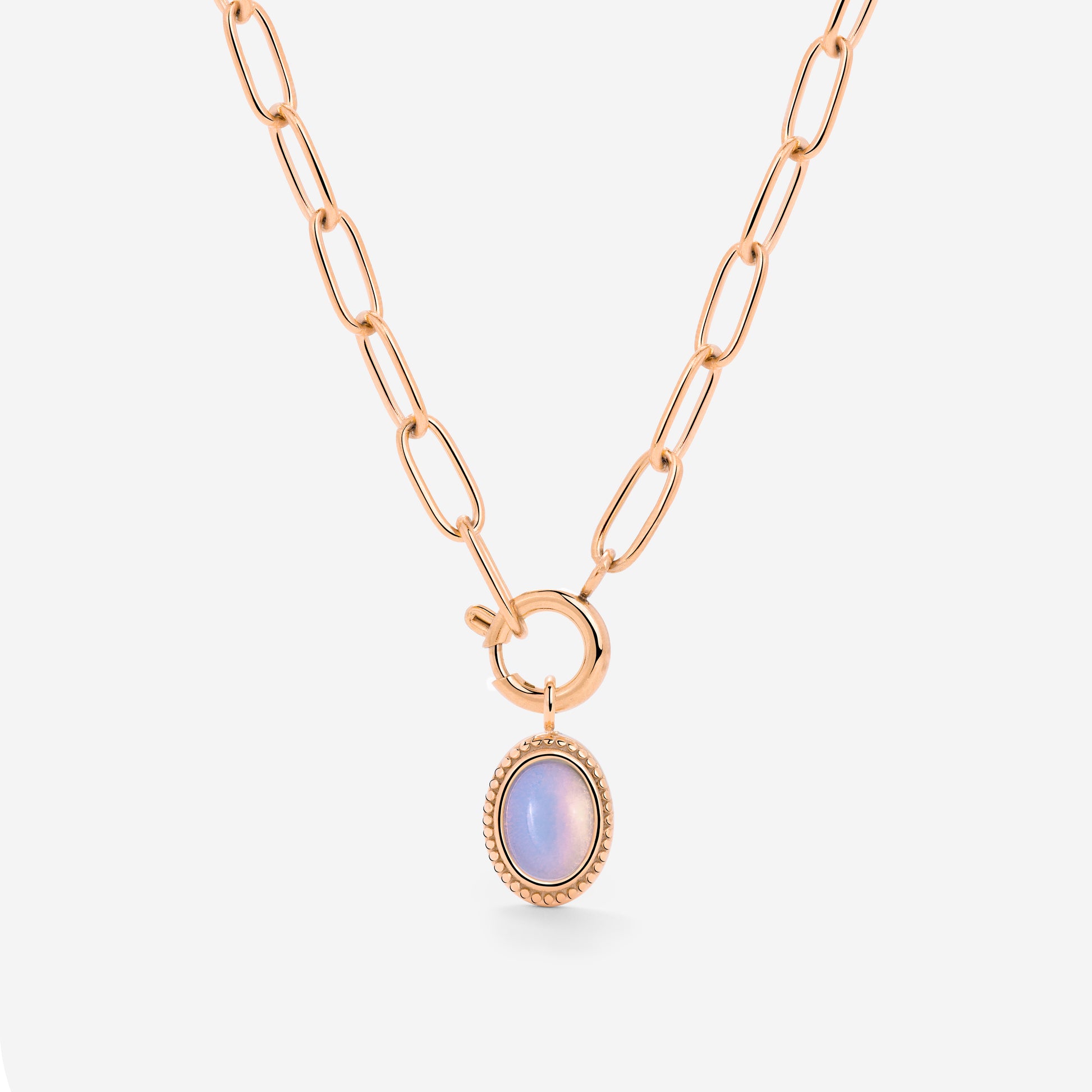 Opal is not only known for its colorful, iridescent play of colors and unique light reflection—it is also considered a protective stone that brings joy and harmony. Wear our 'Opaline' Oval Links Necklace Set with the opal charm and timeless, elongated chain as a guide to inner peace, love, and patience, and let its positive energy surprise you. Psst... Don’t miss out on our other shimmering natural stone charms, each with their own unique properties!