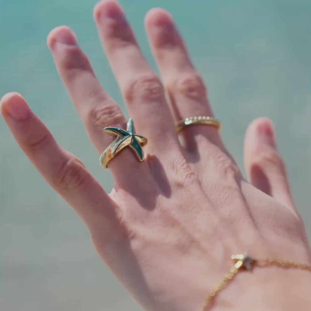 Our 'Sea Star' Ring brings the ultimate mermaid vibes directly to your finger. The slightly wider, yet clean band pairs perfectly with the bold starfish on top – bold, loud, unique, everything you need for this summer. This statement piece will quickly become your favorite jewelry and should not be missing from your outfit rotation. For anyone who needs a bit of that 'Under the Sea' feeling!