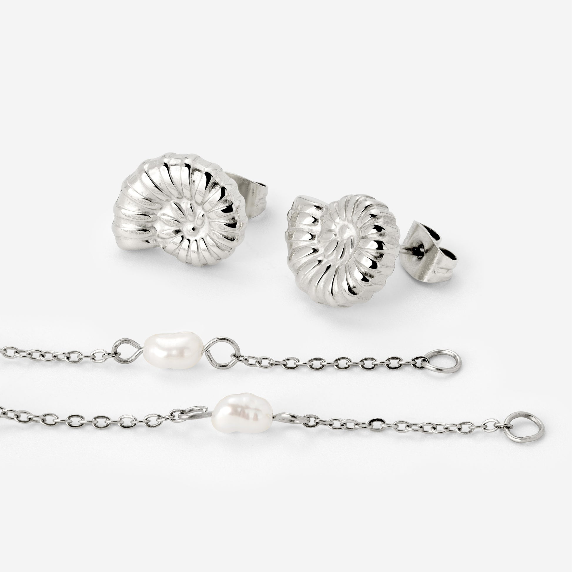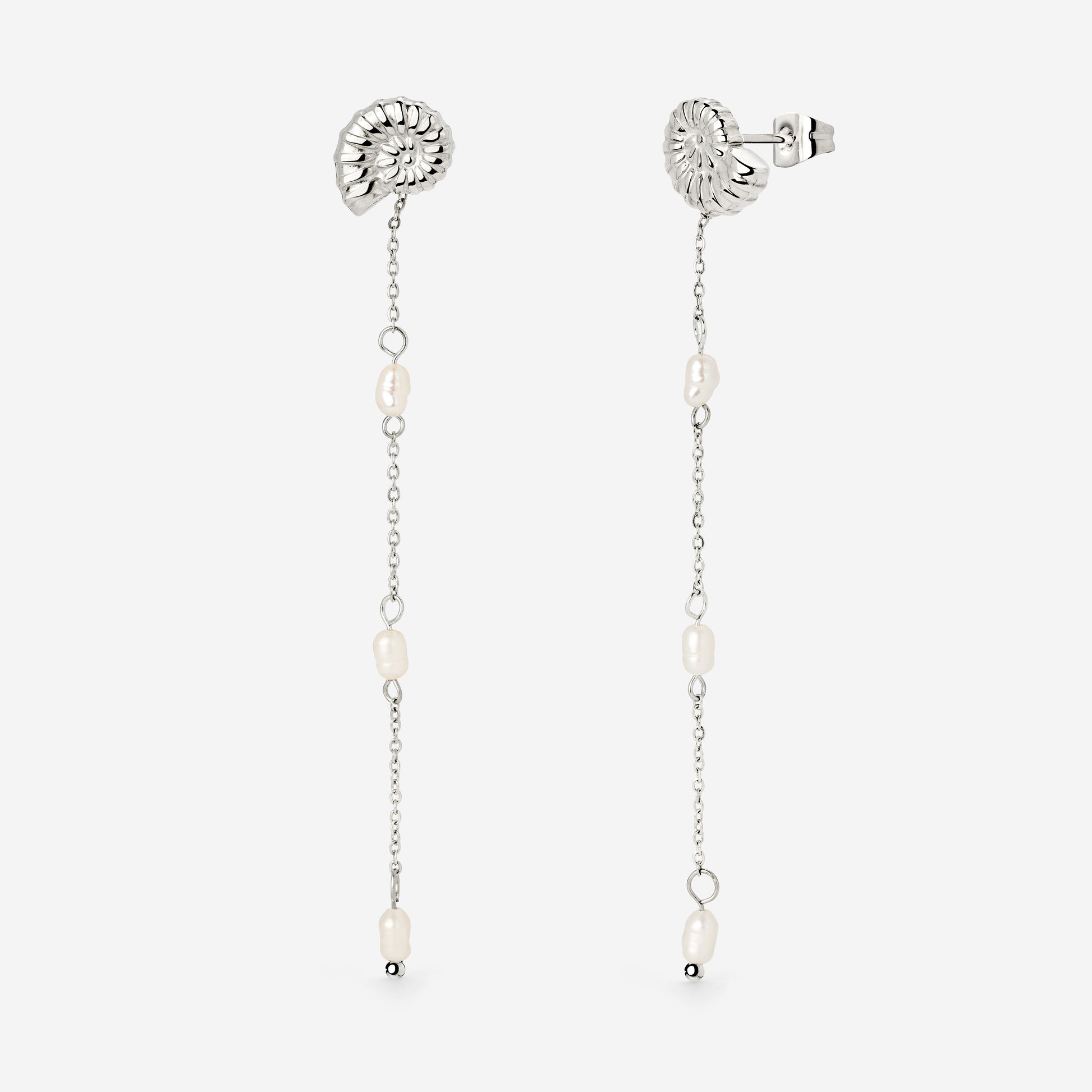 Lightness and elegance know no bounds in our “Siren’s Spell Pearl Drop” earrings. The small but intricately detailed ammonite studs are adorned with three naturally shaped freshwater pearls, each connected by delicate chains — adding a touch of luxury to the piece. What makes these earrings extra special? The pearl drops are detachable, giving you two looks in one! Want to keep things simple? Wear the studs on their own. Feeling a little more elevated? Attach the pearl elements for an elegant pair of earrings perfect for any special occasion.
