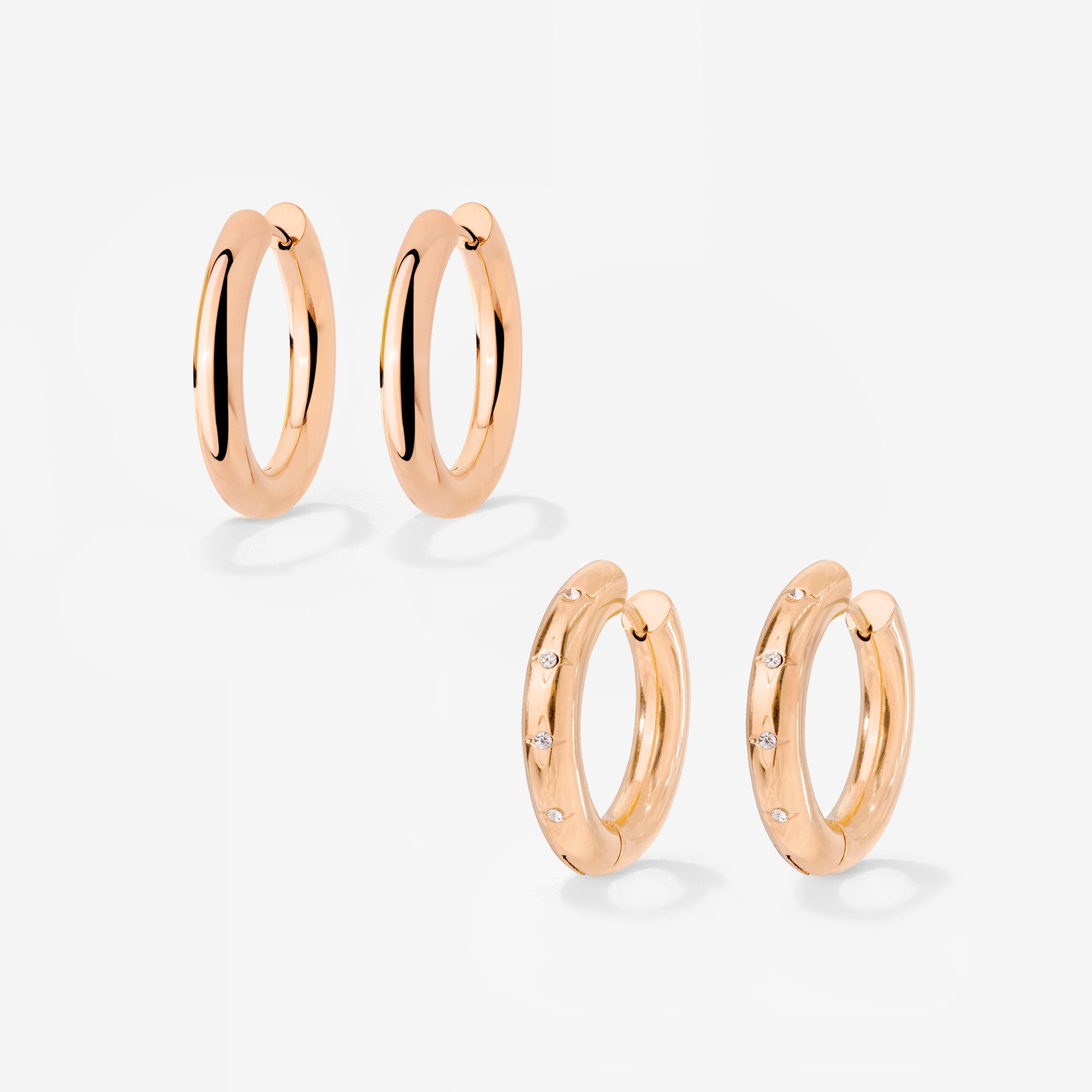 Chunky plus chunky makes bold and classy! Grab our basic “Chunky Hoopies” and our “Cute Stargaze Hoops” in size Medium and wear them together for the perfect match. While one pair is clean and simple, the other shines with sparkling cubic zirconia stones, adding glamour and sparkle to your look. Just like the stars in the sky, you can make yourself and your outfit shine!