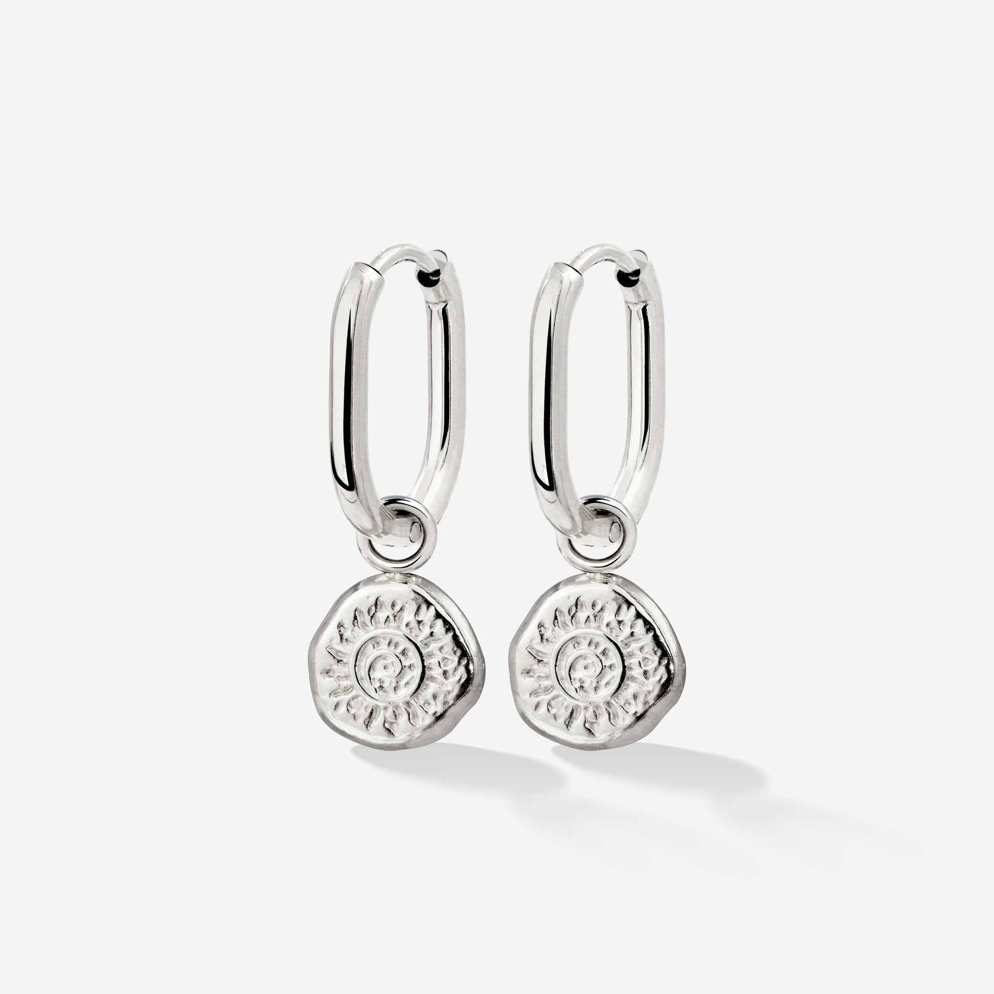A sun motif, but with a twist - with our 'Oval Sun Seeker' Hoop Set Baby, we engrave the sun on a coin charm for a bit of variety on your ear. Combined with the subtle oval hoops, it creates the perfect companion for those who prefer to keep their ear candy game a bit more classic and understated, without sacrificing the summer vibes.