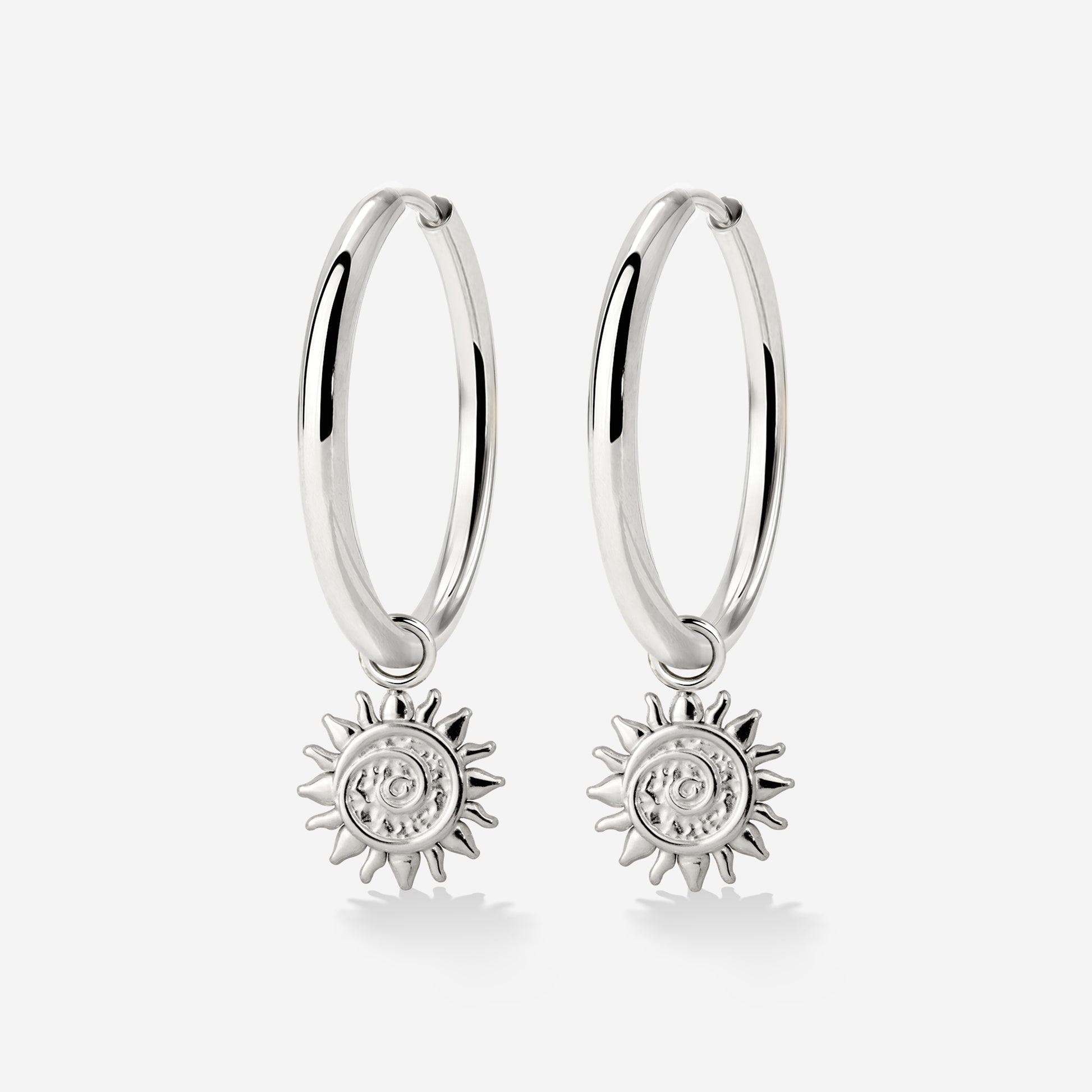 With our 'Sunny Swirl' Hoop Set in size Large, you carry the sun and good vibes with you wherever you go! Our classic, sleek hoops combined with the radiant sun charm are the perfect addition to any of your summer looks and will surely make you stand out, whether in the city or at the hottest beach party.