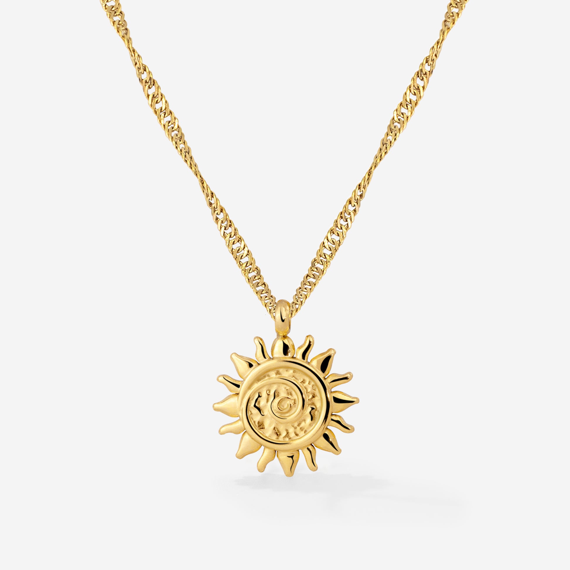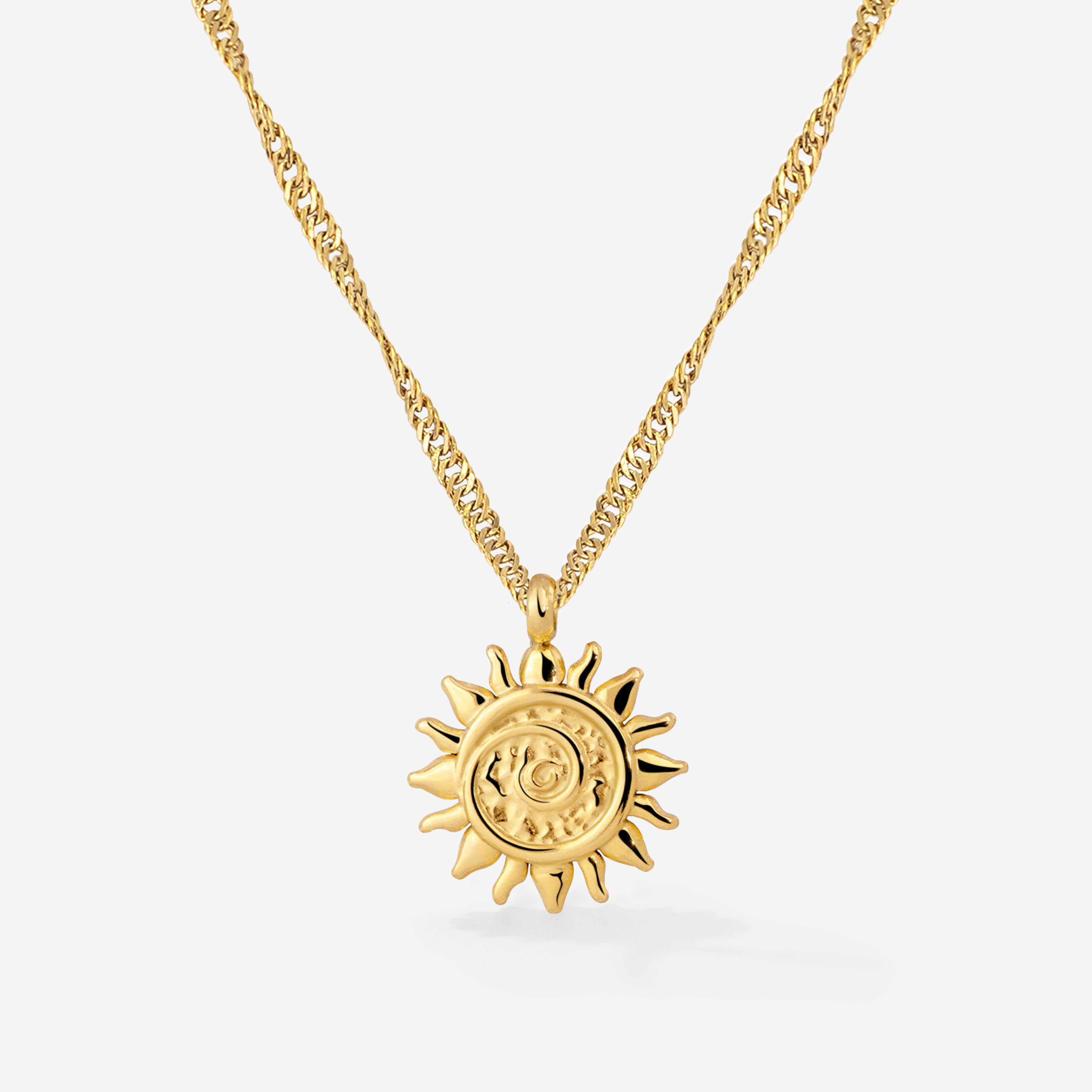Our 'Sunny Swirl' Necklace combines the timeless sun motif with the modern swirl design and is one of the standout pieces in our collection. The intricate charm looks especially elegant on the delicate Singapore chain, enhancing any of your looks, whether worn alone or layered. Get your favorite sun-lover's piece now!