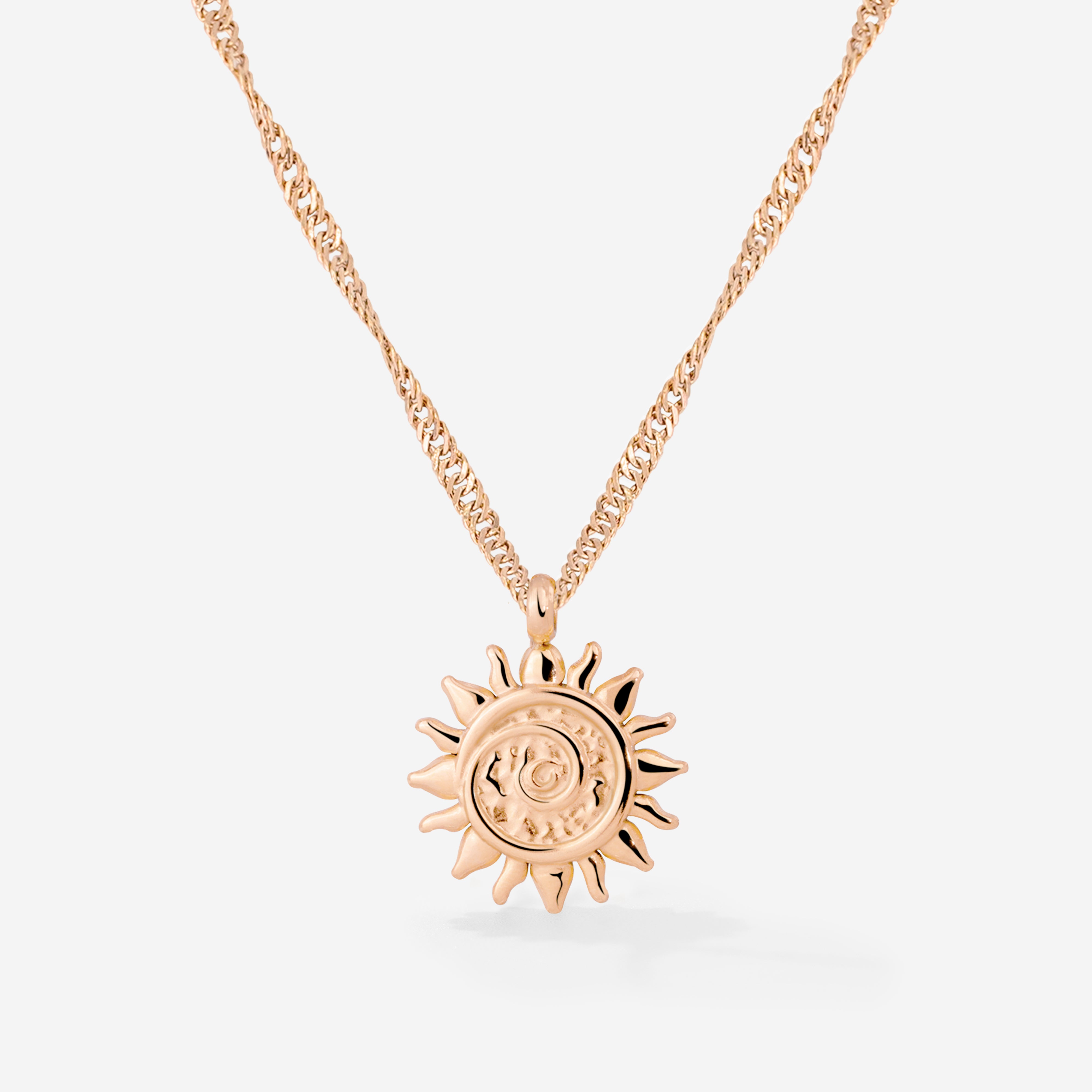 Our 'Sunny Swirl' Necklace combines the timeless sun motif with the modern swirl design and is one of the standout pieces in our collection. The intricate charm looks especially elegant on the delicate Singapore chain, enhancing any of your looks, whether worn alone or layered. Get your favorite sun-lover's piece now!
