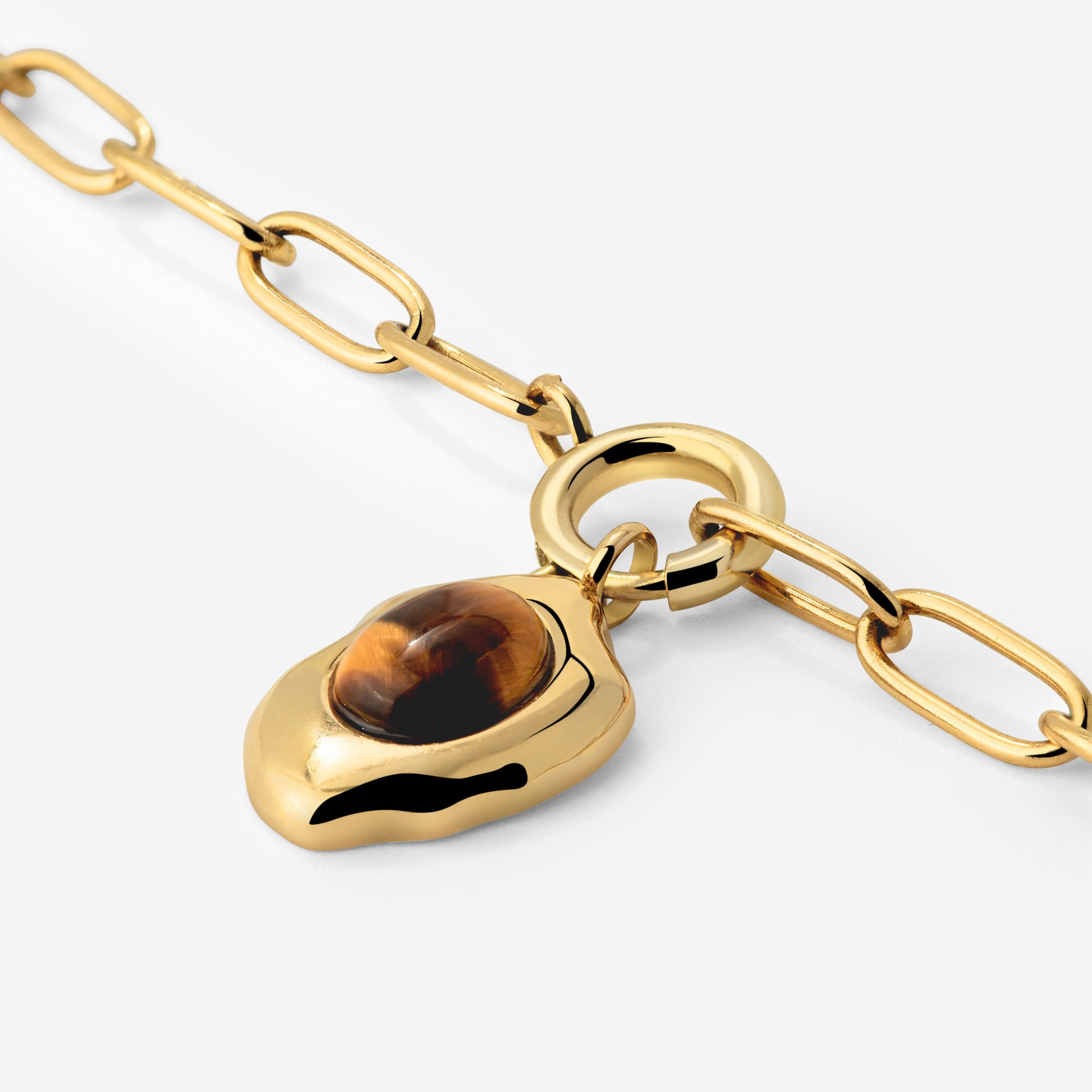 For centuries, tiger’s eye has been considered a healing stone believed to enhance intuition and dissolve mental blockages, especially when it comes to decision-making and creativity. With our “Tiger’s Eye” Oval Links Necklace Set, you can carry this golden-brown gemstone with you at all times and experience its energy for yourself. Set in a bold oval-link chain with an organically shaped frame, it feels especially elegant and timeless, while being easy to combine and layer with other jewelry. Try pairing this piece with our “Sunflare Gem” Choker to double the empowering effect of tiger’s eye!