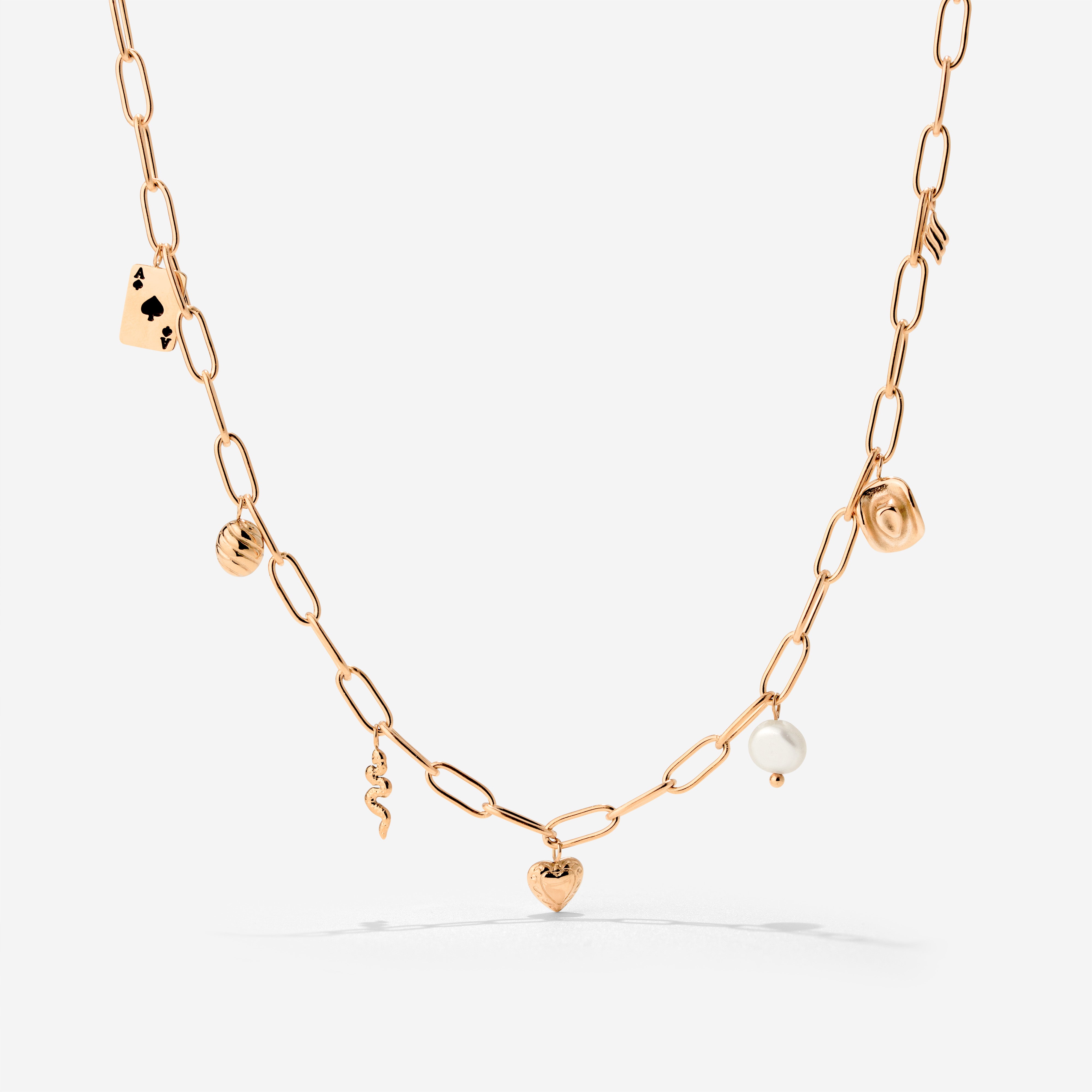 Unsere “Treasure Box” Necklace ist eine kleine Sammlung von Schätzen und perfekt für dich, wenn du dich nie zwischen Charms entscheiden kannst. Die ovalen, länglichen Kettenglieder eignen sich perfekt, um die verschiedenen Anhänger zu präsentieren. Vom Pik-Ass, übers Herz bis hin zum süßen Cowboy-Hut und kleiner Schlange haben wir alle Leitmotive unserer Kollektion in einem Schmuckstück vereint, damit du einfach alles haben kannst! Und psst.. Hierzu gibt es auch unser passendes “Treasure Box” Bracelet!